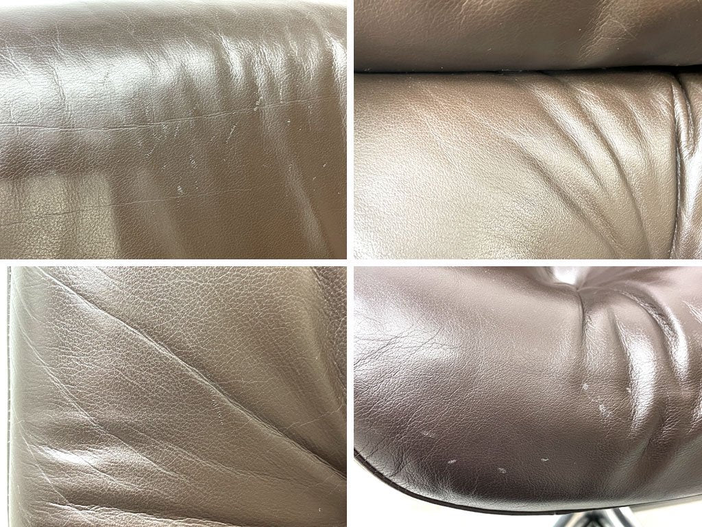 ローズウッド材と思われるプライウッドフレームに、ボリューム感のあるレザーシートをあしらった1脚。