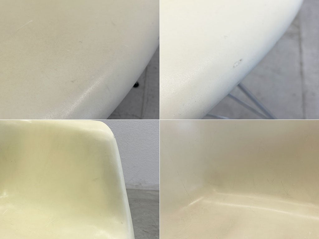元々のカラーはホワイトかと思われますが、現在は日にヤケてパーチメントのようなカラーになっております。アーム先端やシートの前面にはやや打痕によるダメージがあり、シートポケット部には擦過によるライン傷などが複数ございます。