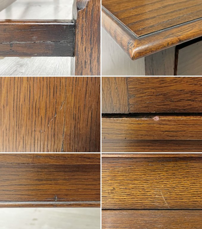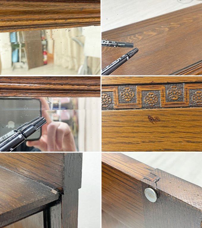 こちらはビンテージ品となります。経年に伴う擦れや傷、打痕、色ムラや色あせ、突板部分の一部カケ、木部の一部ひび割れ、ミラー内部の黒ずみや取り切れない汚れ、一部シール痕のような質感の違う箇所がございますが、美観を損なうような汚れや、機能を損なうような大きなダメージなどは特にございません。ミラーバックの支柱の強度は元々の構造上そこまで強いものではなく、強く動かすとグラつきますが、通常使用ではそこまで影響はございません。