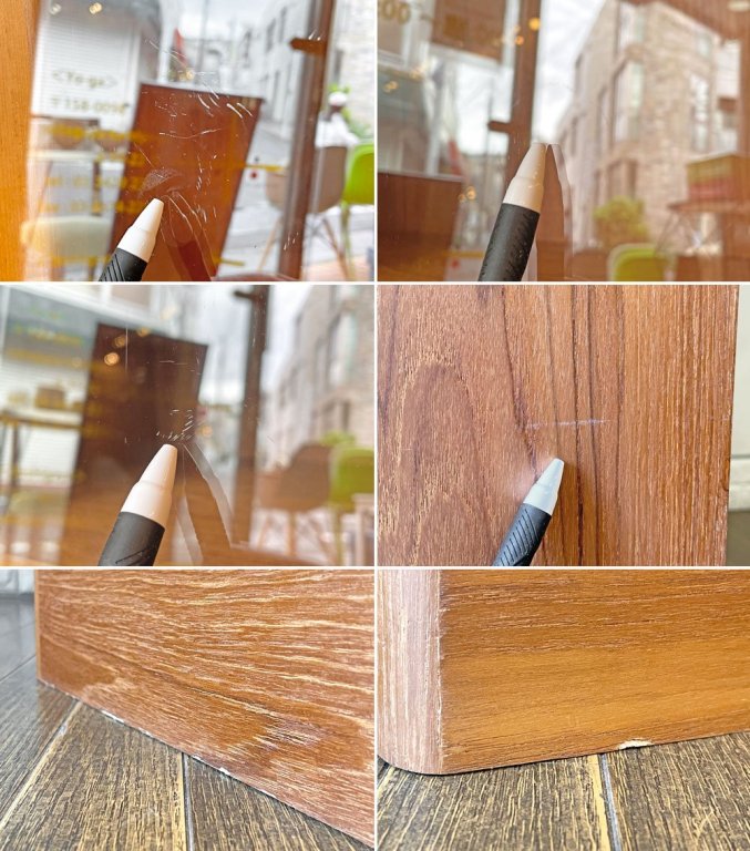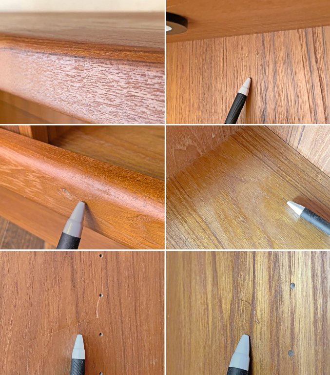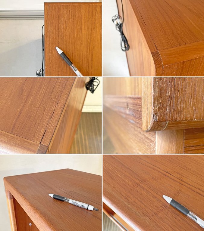 こちらはビンテージ品となります。使用に伴う擦れ傷の他、細かな線傷や天面のシミ、テカリ、足先を中心とした突板の剥がれ、裏側の天面には縁の材の接着が剥がれた際に起きた突板における亀裂の修復痕など幾分の使用感はございますが、いずれも大きく目立つものではございません。また、こちらにはもともと上段の収納に付いているガラス引き戸が欠品しております。違和感は然程感じられず、また実用に問題となるものではございませんが、状態を鑑み通常よりお求めやすいお値段での販売となります。予めご承知の上ご検討下さいますようお願い申し上げます。