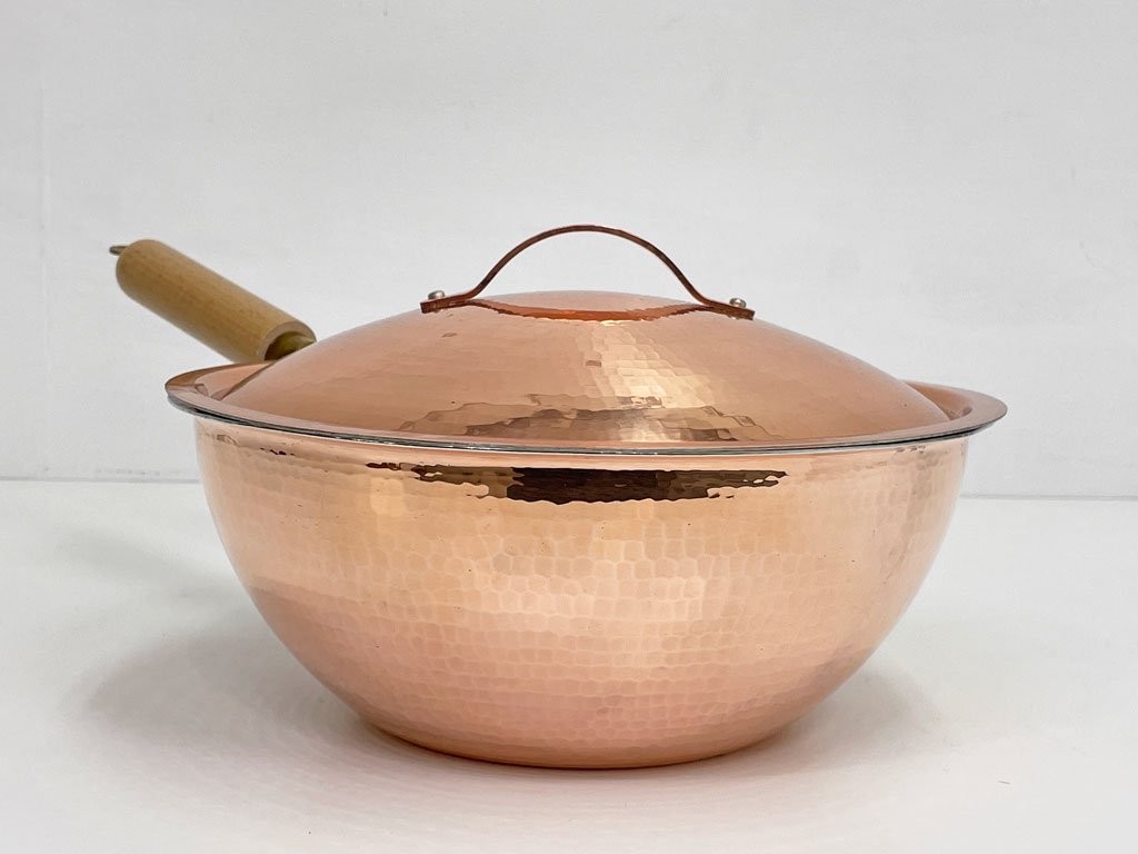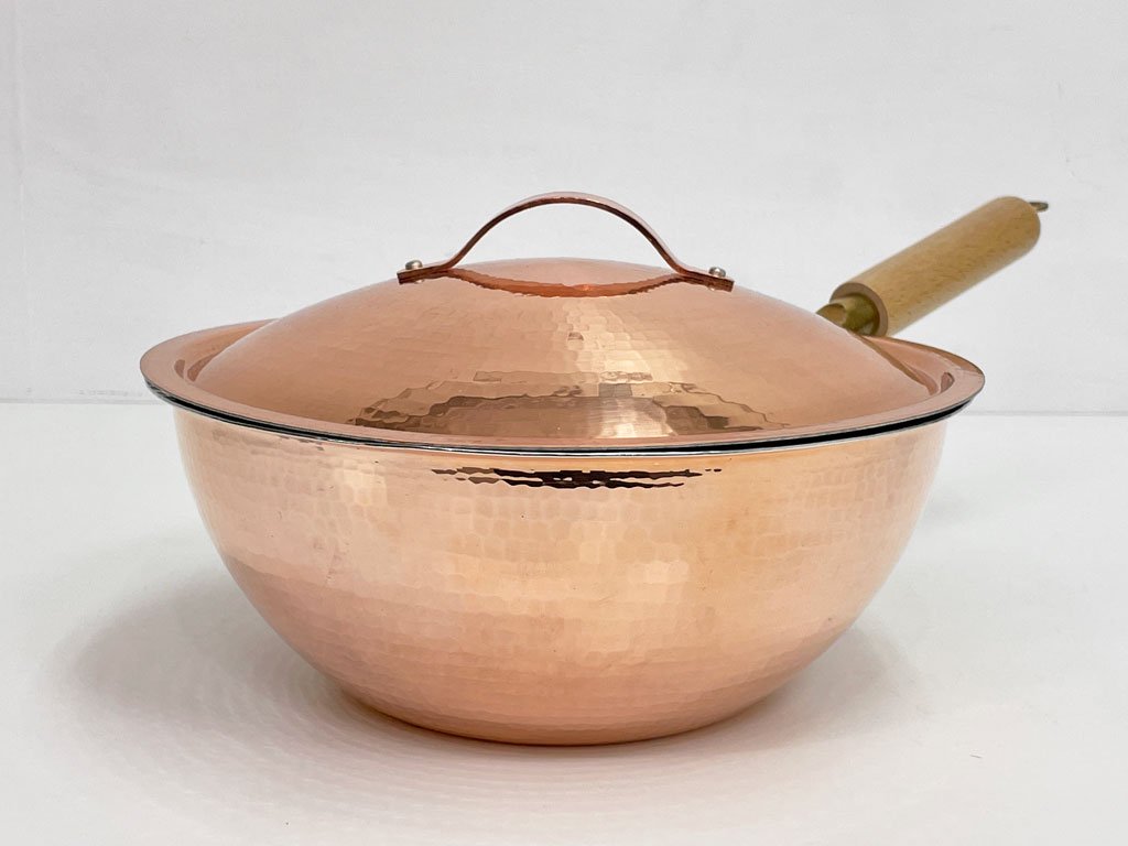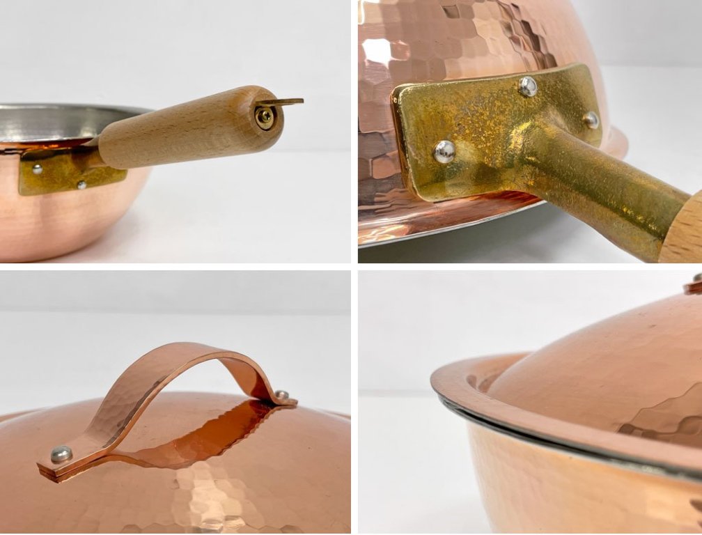 片手銅鍋 蓋付き 槌目 ビーチ材 ハンドル