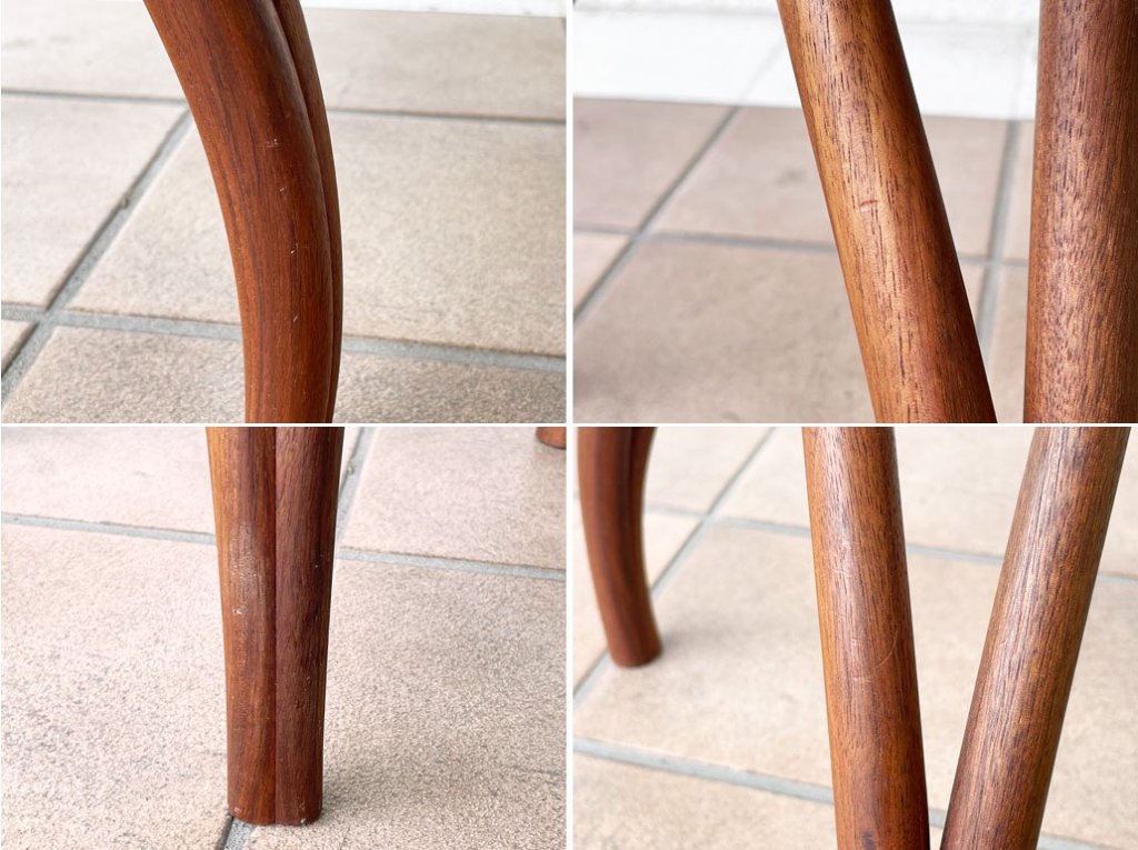 使用に伴い座面に細かな打痕や擦れ、脚先に擦れや僅かな着色等が見られますが、大きく美観を損ねるダメージはございません。ガタツキや割れ等使用上問題となる点も無く、概ね良好なコンディションを保っております。