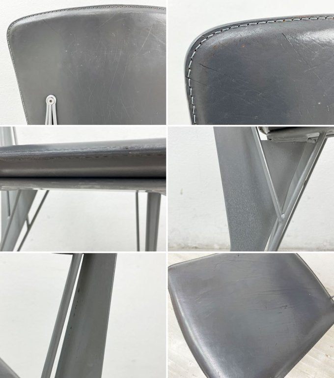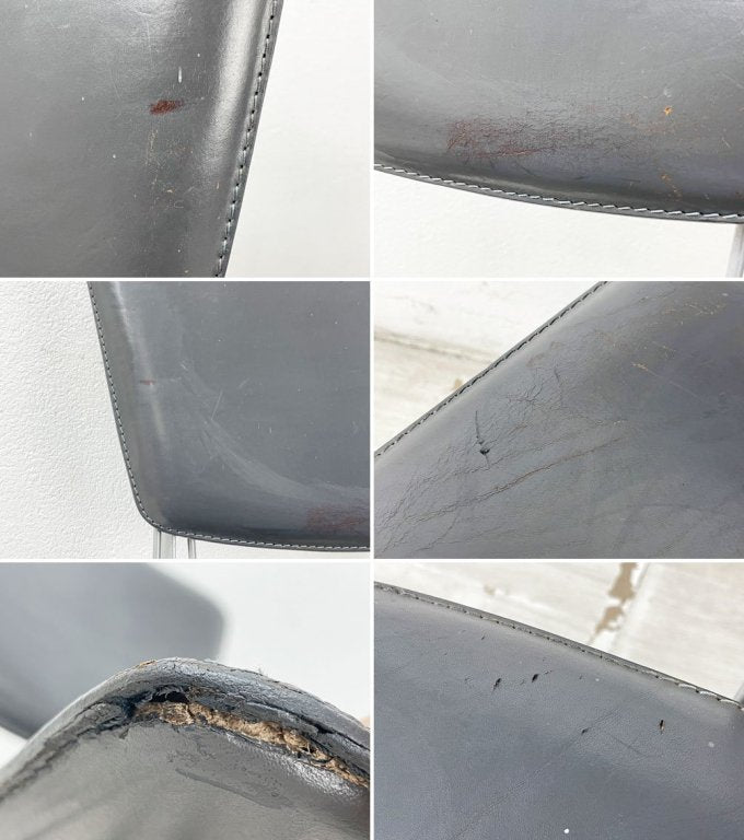 使用に伴い、背座レザー部には、表面の剥がれやヒビ割れ、染み汚れや色ムラ等が見受けられるとともに、僅かな破れの箇所がございます。また、脚部には擦れや傷、錆、くすみなどの取りきれない汚れが見受けられますが、使用上問題となる大きなダメージはございません。これからも安心して実用頂けるコンディションを保っております。