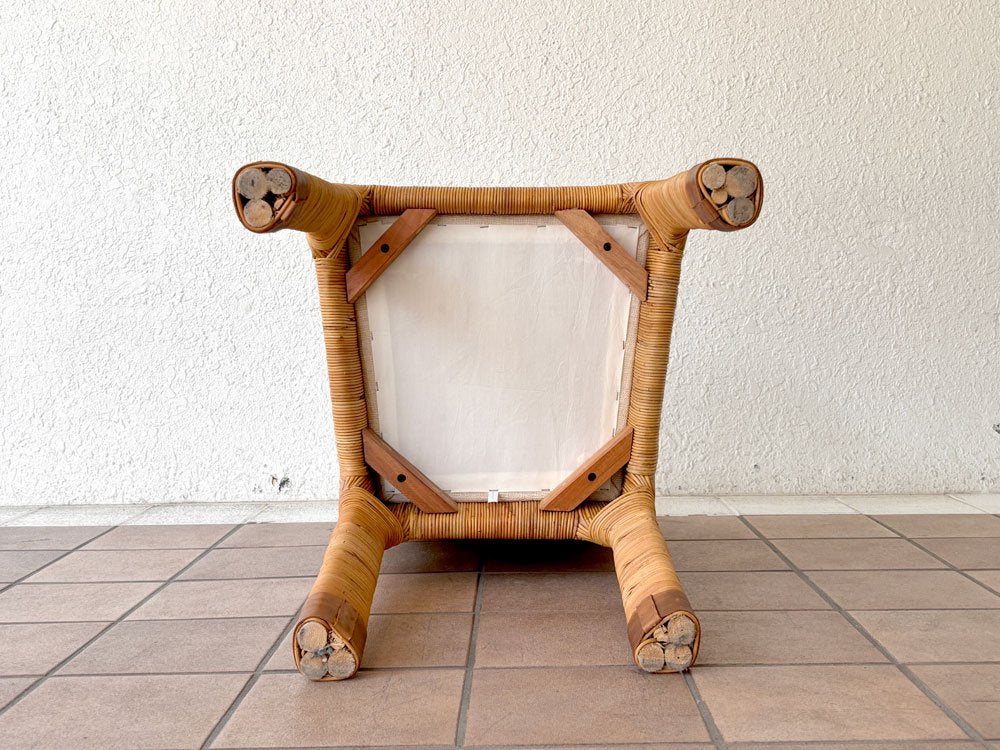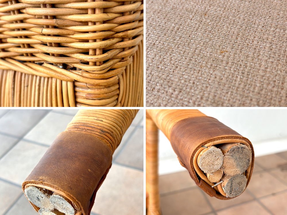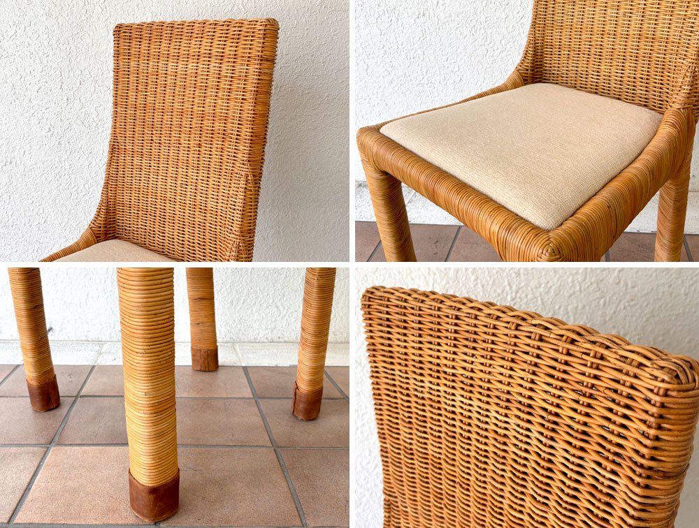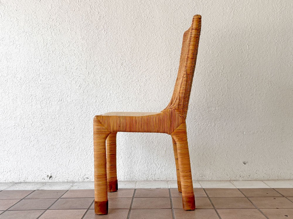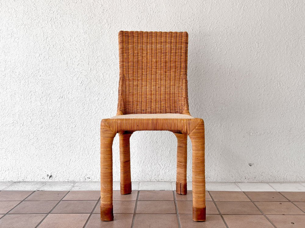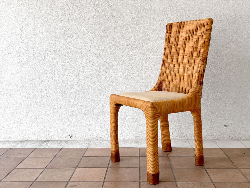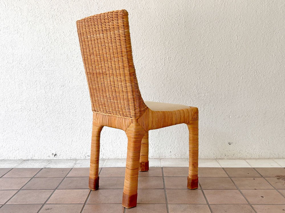 素材の力を強く感じることのできるラタン製のチェア。ごくシンプルな造形のチェアが、皮付きラタンを丁寧に編み込まれることで南国の雰囲気を伝える独特な佇まいに仕上がっており、脚部の先端のレザーも良いアクセントに◎。