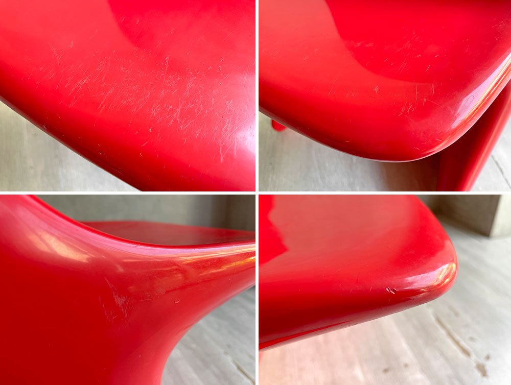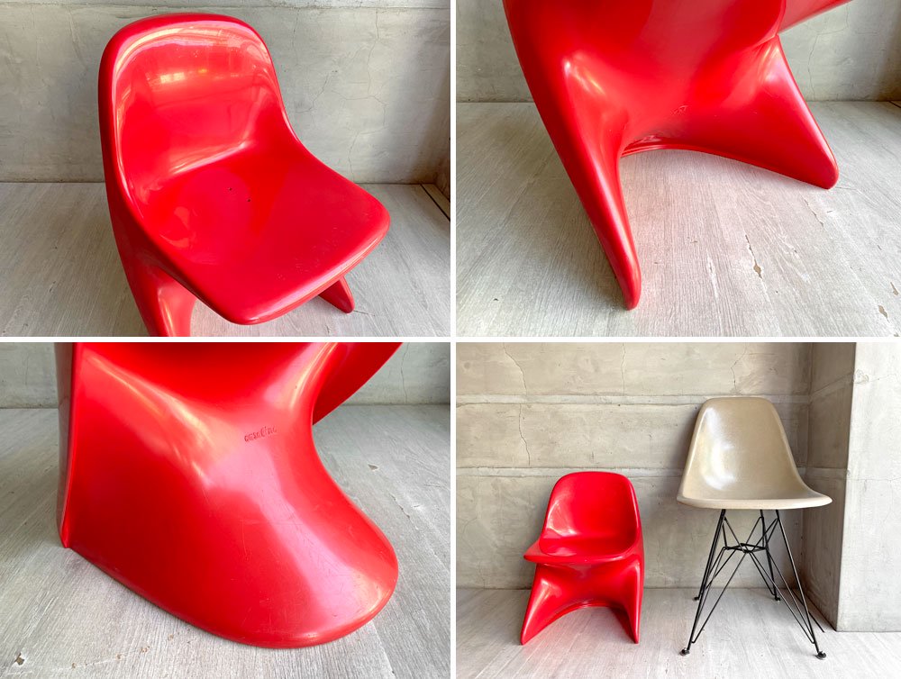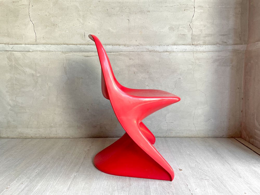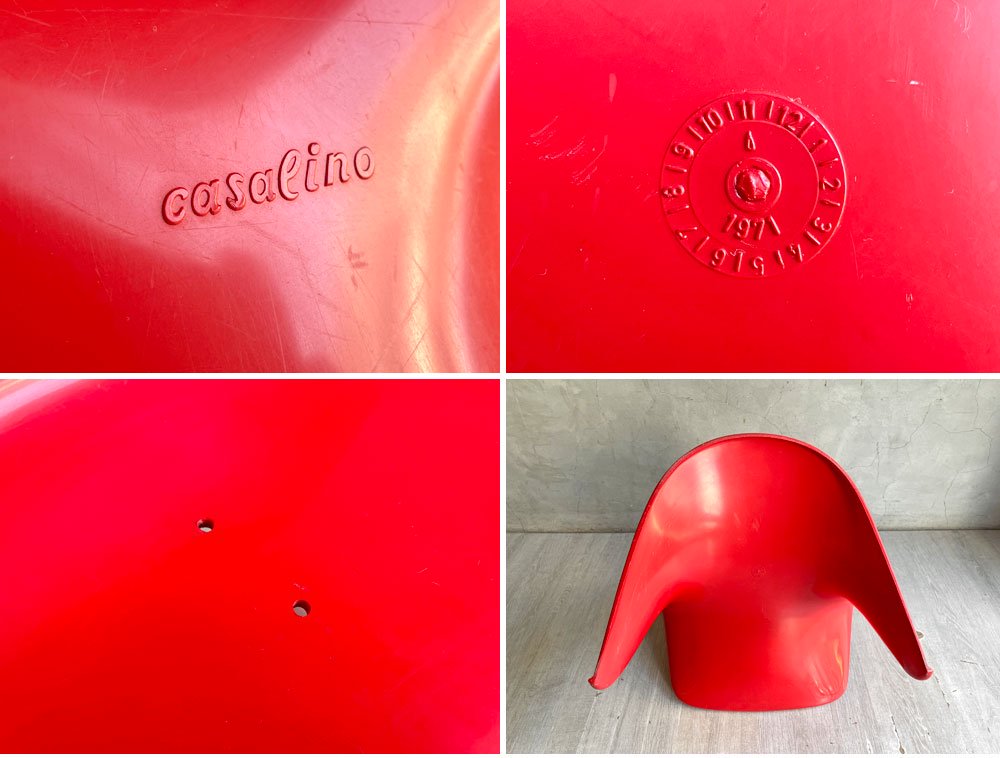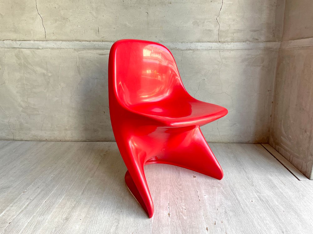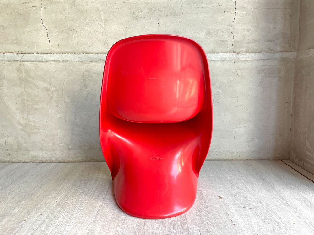 こちらそんなカサラ社の1971年に製造された「Casalino0(カサリノ)」キッズチェア。小ぶりなサイズ感ながら目を引く独特なシルエットに鮮やかなレッドカラーが特徴の1脚。