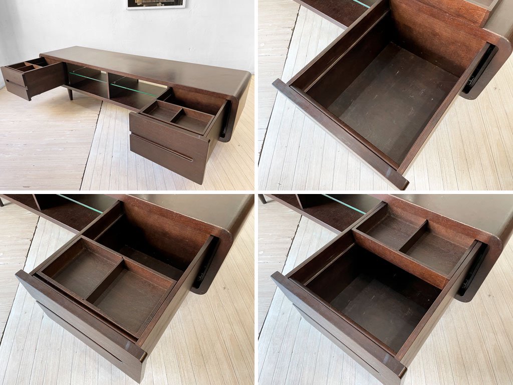 中央のタボ式の高さ調整が可能なのガラス棚に加え、両サイドには2杯のドロワー収納が備わっております。