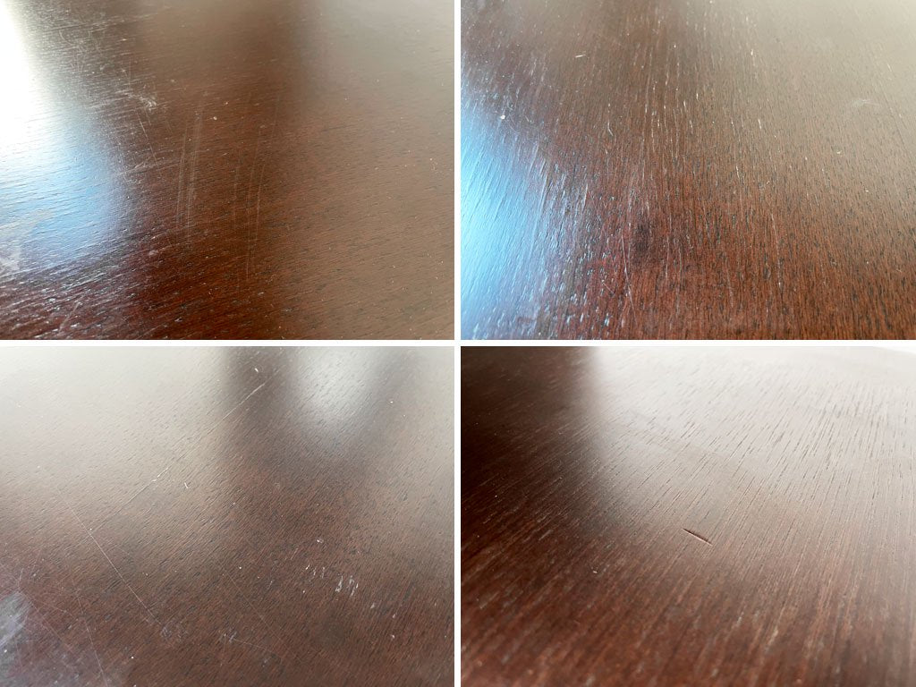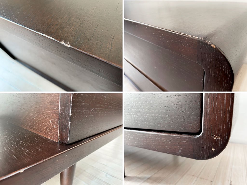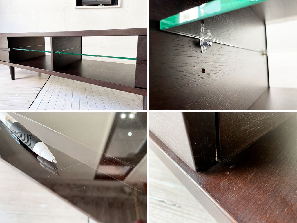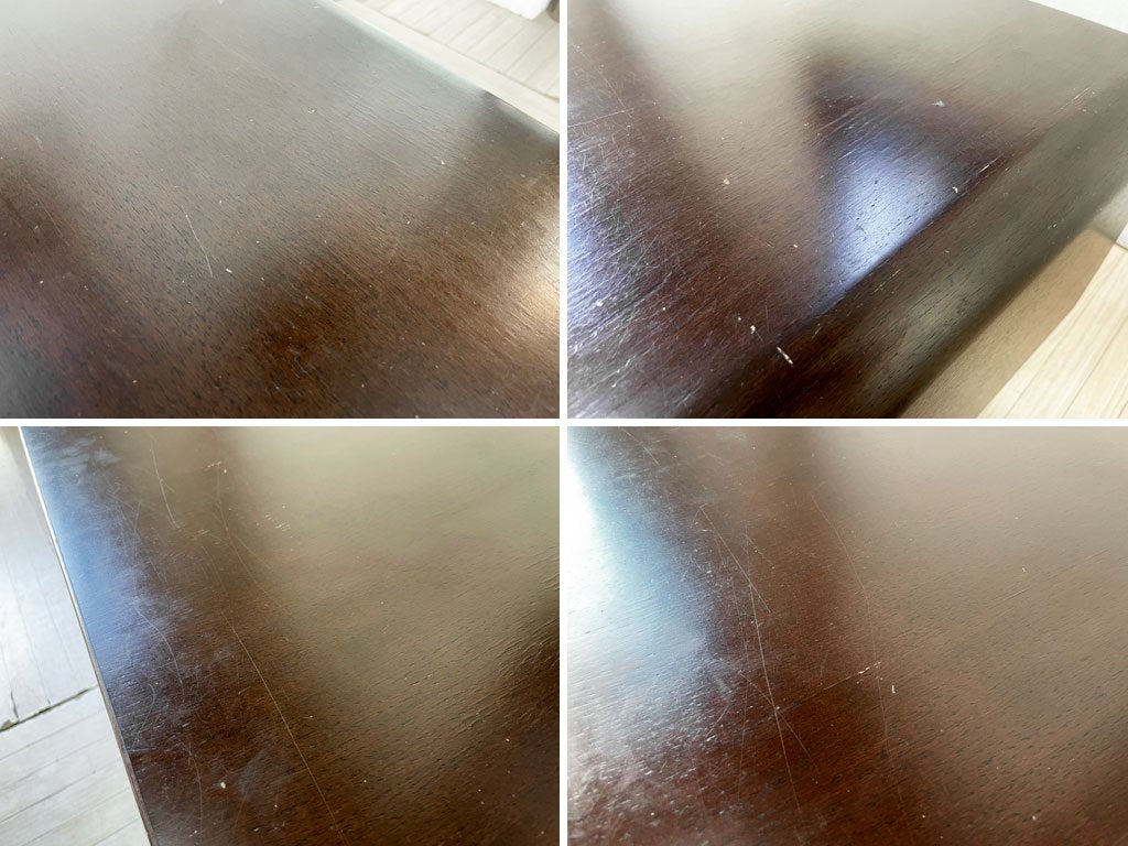 使用に伴う傷や擦れ、打痕やペイントロス、くすみや汚れなどが全体的に見受けられます。また、天板のザラつきやガラス棚板の線傷などがございます。多少の使用感はございますが、ご使用に問題となるダメージなどもございません。コンディションを考慮致しまして、通常よりもお求めやすい価格にて出品致します。