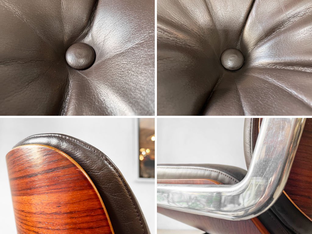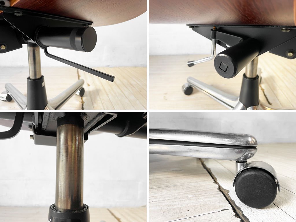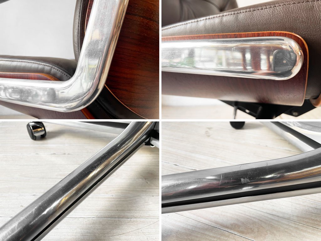 レザー及びウッド部の僅かな小傷や擦れ、金属部の傷やくすみなどがございます。また、座面昇降レバー先端の樹脂パーツの欠品及び昇降機能のガス圧が弱くなっており、座面を上げる際には手でサポートしていただく必要がございます。また、着座をしながら座面を下げる際はやや勢いよく下がってしまいます。その他の機能に問題のある箇所なども無く、大きく目立つようなダメージなどもございません。今後も実用して頂けるコンディションとなっております。
