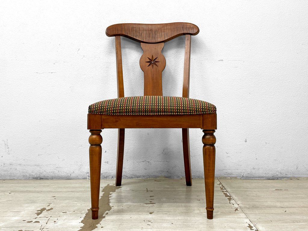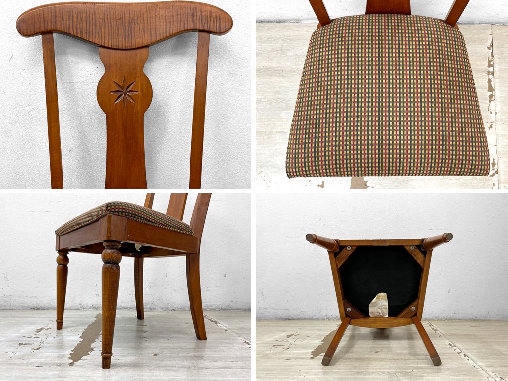 丁寧に彫られた背もたれの八芒星などの細部から、手作業で仕上げられている事が伺えます。