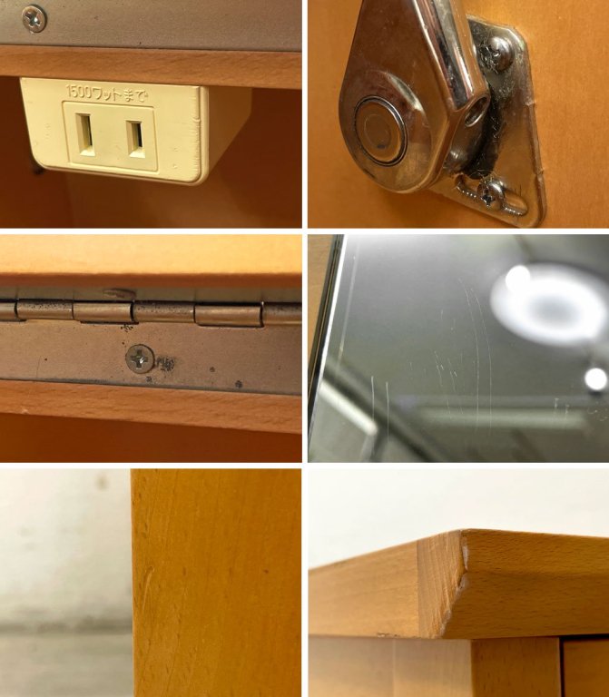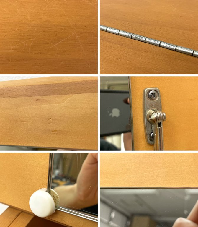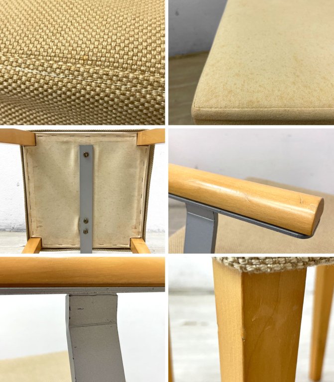 フレームには擦れや傷、軽微な打痕、蝶番などの金属部には取り切れないくすみや錆汚れがございます。また、チェアのカバーや下のファブリックにはシミ汚れが見受けられます。全体的に使用感はございますが、使用に問題となる様な大きなダメージは無く、これからも実用頂けるコンディションを保っております。