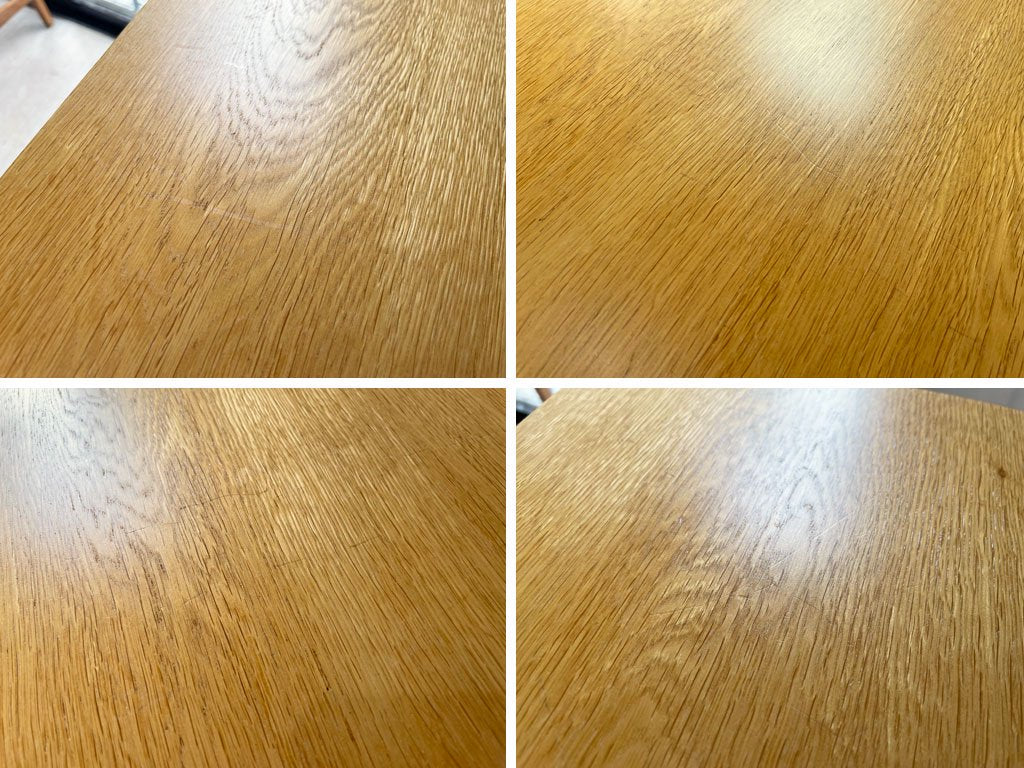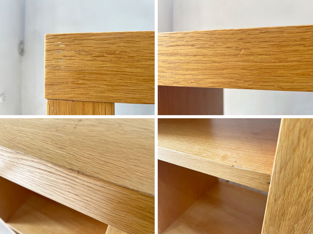 使用に伴う傷や擦れ、軽微な汚れや突板の剥がれなどがございます。また、天板と仕切り板との間に多少の隙間が生じておりますが、強度などにも問題なく、ご使用に問題のある箇所などもございません。これからも安心してご使用頂けるコンディションを保っております。