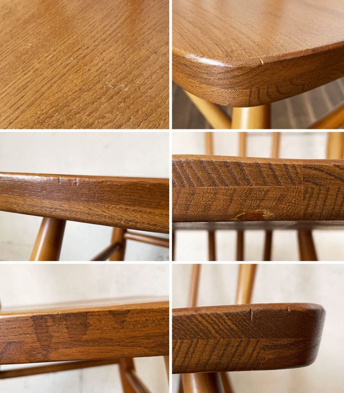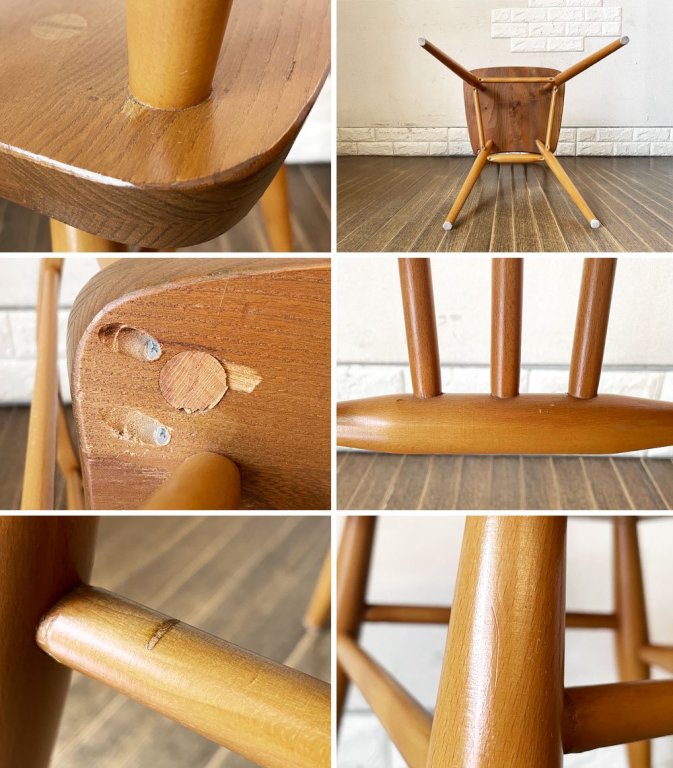 こちらは、ビンテージのお品物です。全体に擦れや傷、打痕、縁の削れ、黒ずみなど取り切れない汚れ等が散見されます。また、脚部や座面との接合部はビスにて後年補強が施されており、がたつきやぐらつきなどのご使用に問題となるダメージはございません。経年の風合いをお楽しみいただきながらこれからも気持ちよく実用いただけます。