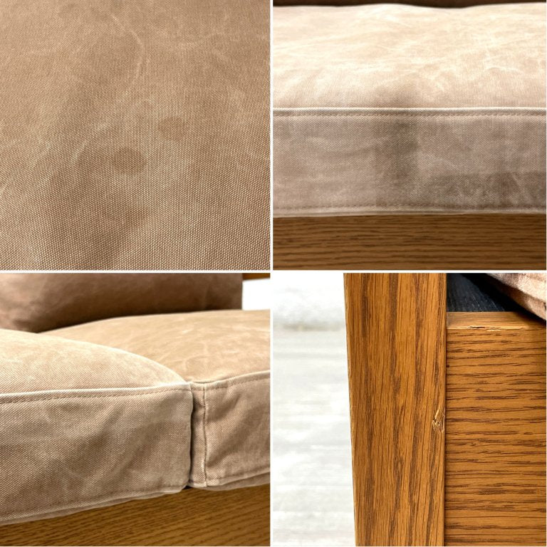 使用に伴う擦れや傷、欠けや、打痕、色褪せ、ファブリックの染み、色褪せ、ファブリッククッション前面の日焼け跡などが見受けられます。その他、美観を大きく損ねる様な汚れや、ヘタリ等の機能を損なうような大きなダメージなどは特にございません。