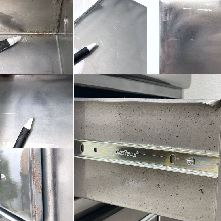 使用に伴い、擦れや傷、取り切れない汚れ、錆び等が見受けられます。その他金属部にくすみ等がございますが使用上問題となる大きなダメージはございません。なお、こちらのお品物は喫煙の空間で使用されていたため、抽斗内部にやや臭いが感じられます。クリーニングは行っておりますが、特に非喫煙者の方は現状をご理解頂きお買い求め下さいませ。
