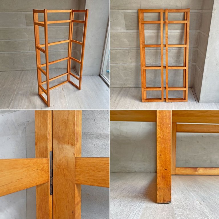 こちらは蝶番で開くフレームに棚板を差し込むという、個性的な構造をしたオープンシェルフです。