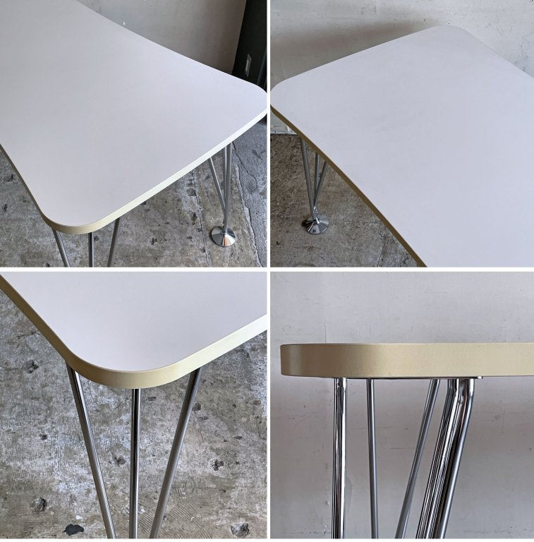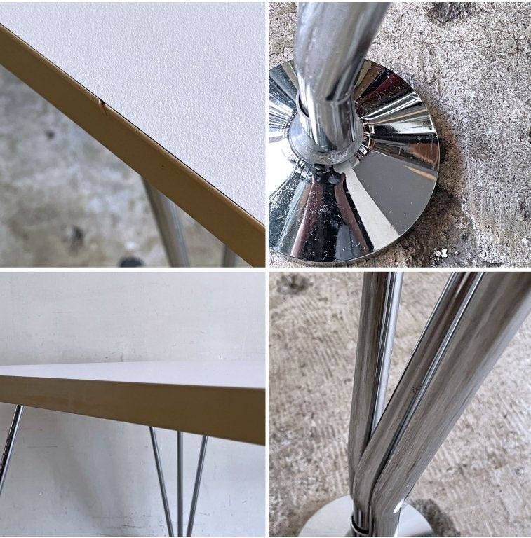 使用に伴い、細かな擦れや傷、天板の縁に黄ばみと小さな打痕、脚部に素材特有のくすみや小傷、細かな錆が見受けられます。