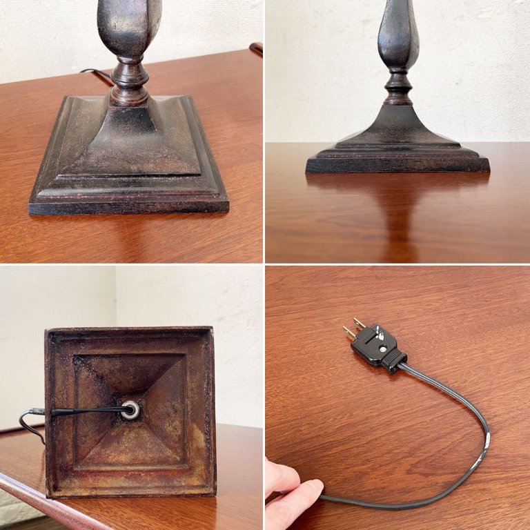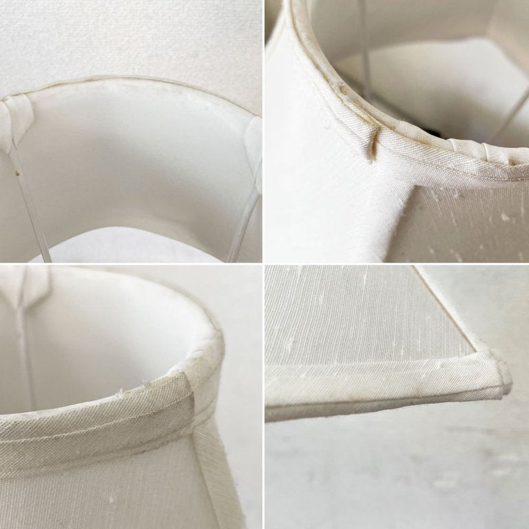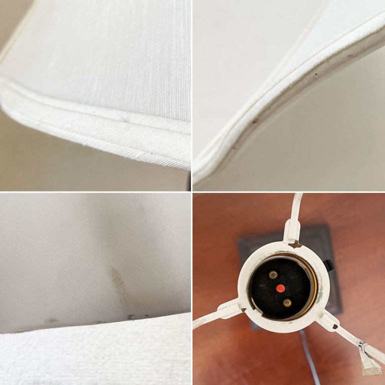 使用に伴い、シェードには黒ずみやシミなどの取り切れないが散見されるほか、若干の毛羽立ちがございます。また、ベースにはくすみや錆等がございますが、こちらはビンテージのような風合いをお楽しみいただける程度かと思われます。なお、ソケットの留め具に僅かな傾きや緩みがありシェードにも傾きが生じます。電球の交換の際にはソケットを押さえながらシェードを取り外してください。その他、コードにペンキ汚れがございますが、ソケットスイッチでのON/OFFの切り替えに不具合はございません。