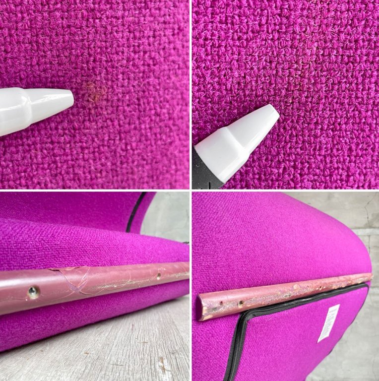 クリーニングで落としきれない薄染みや、頂点部分の毛羽立ち、底面プラパーツの擦り傷など、やや使用感が見られるものの、着座においての不具合は無く、十分実用可能なコンディションを保っております。