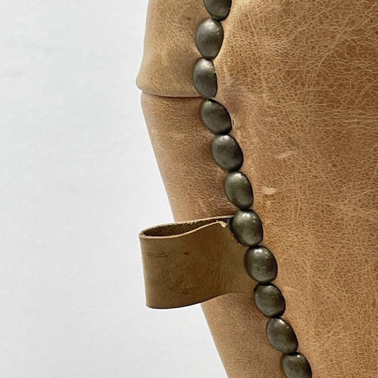 縦に凹凸のあるラインで仕上げ、厚みをしっかり持たせた背もたれは、両サイドより包み込むようにカーブを描き、着座の際の心地よいホールド感を感じさせてくれます。背もたれ背面にはアンティークゴールド色の鋲打ちが施されバックスタイルのアクセントになっています。