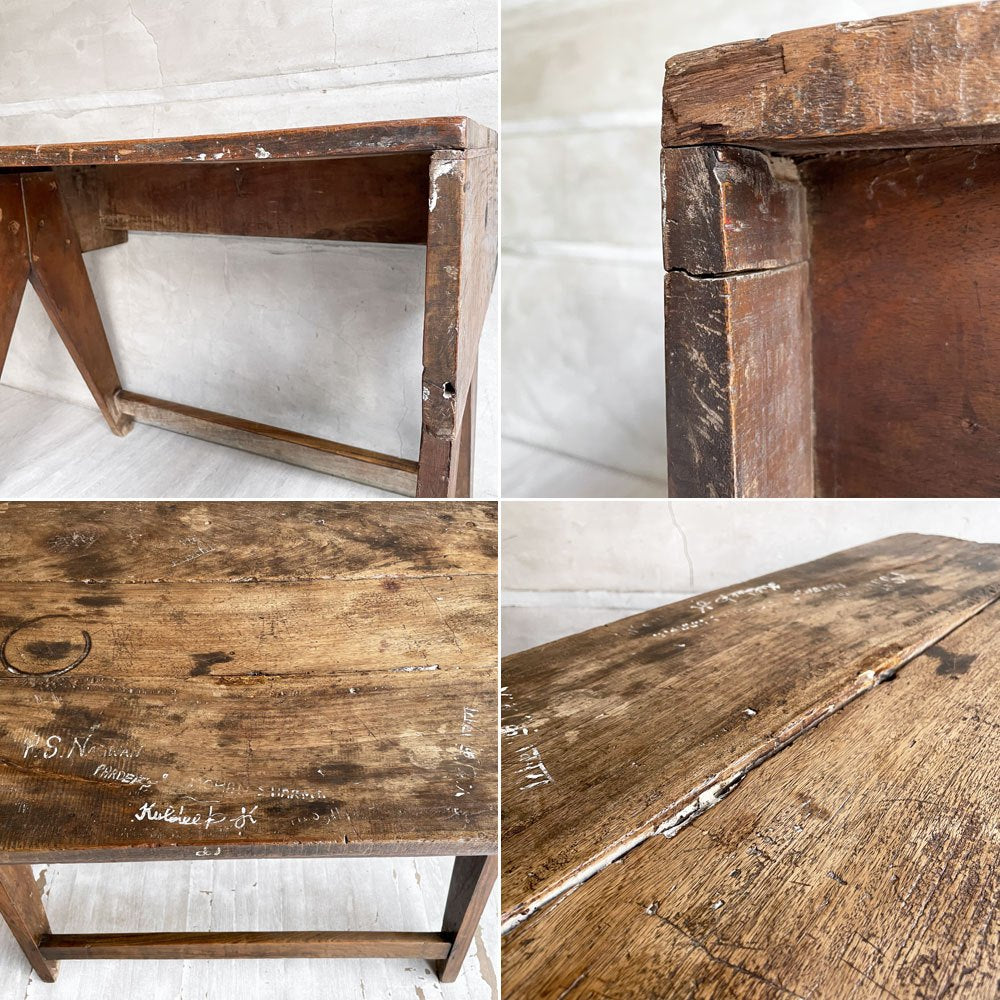 経年により深く色付いたチーク無垢材の粗い木肌や天板の落書きの跡からは、長い年月の歩みと当時の学生たちの日常、その空気が感じられます。