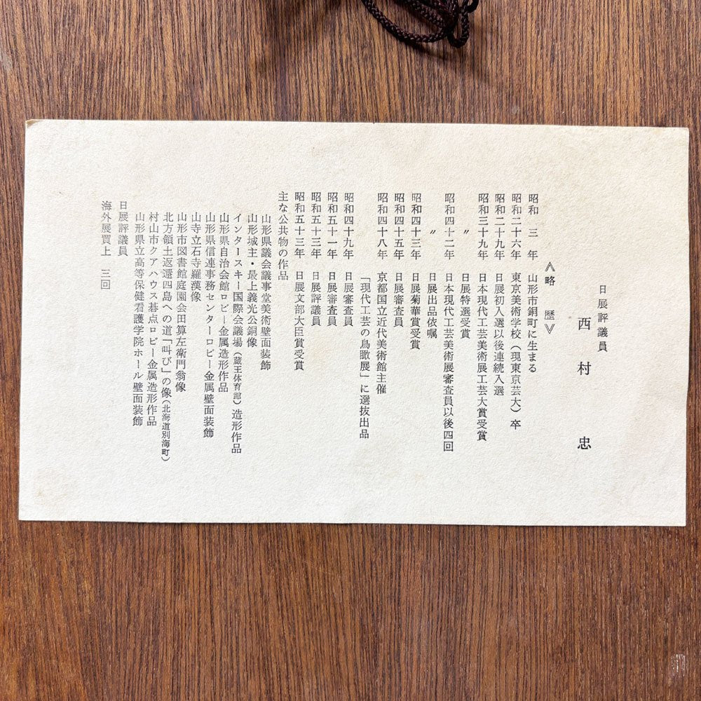 文部大臣賞、菊華賞、工芸大賞等の受賞歴を持つ山形市出身の鋳金工芸家・西村忠氏の作品。