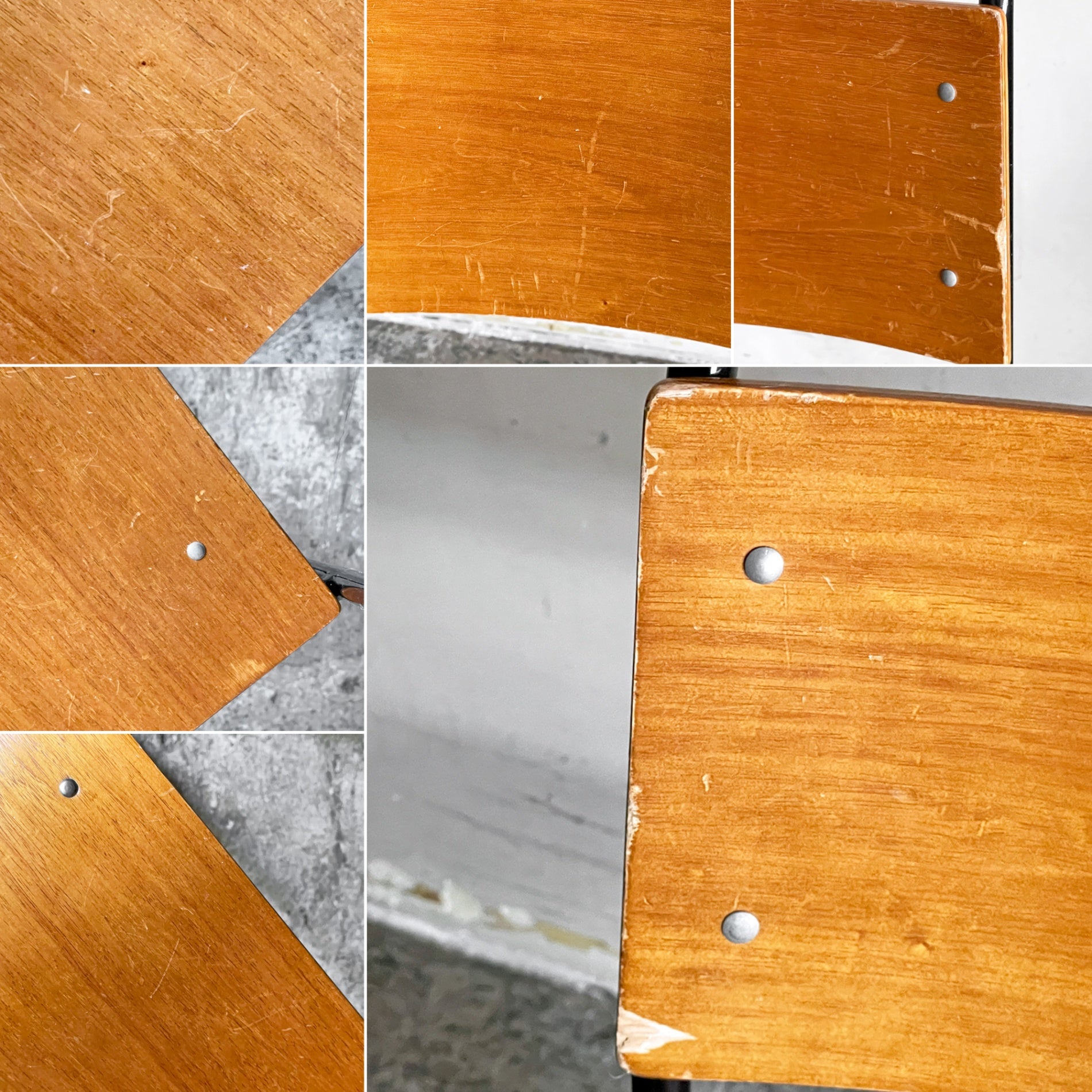使用に伴い、木部には細かな傷や擦れ、打痕、端の細かな突板の欠け、色褪せ、取り切れない微細な汚れが御座います。