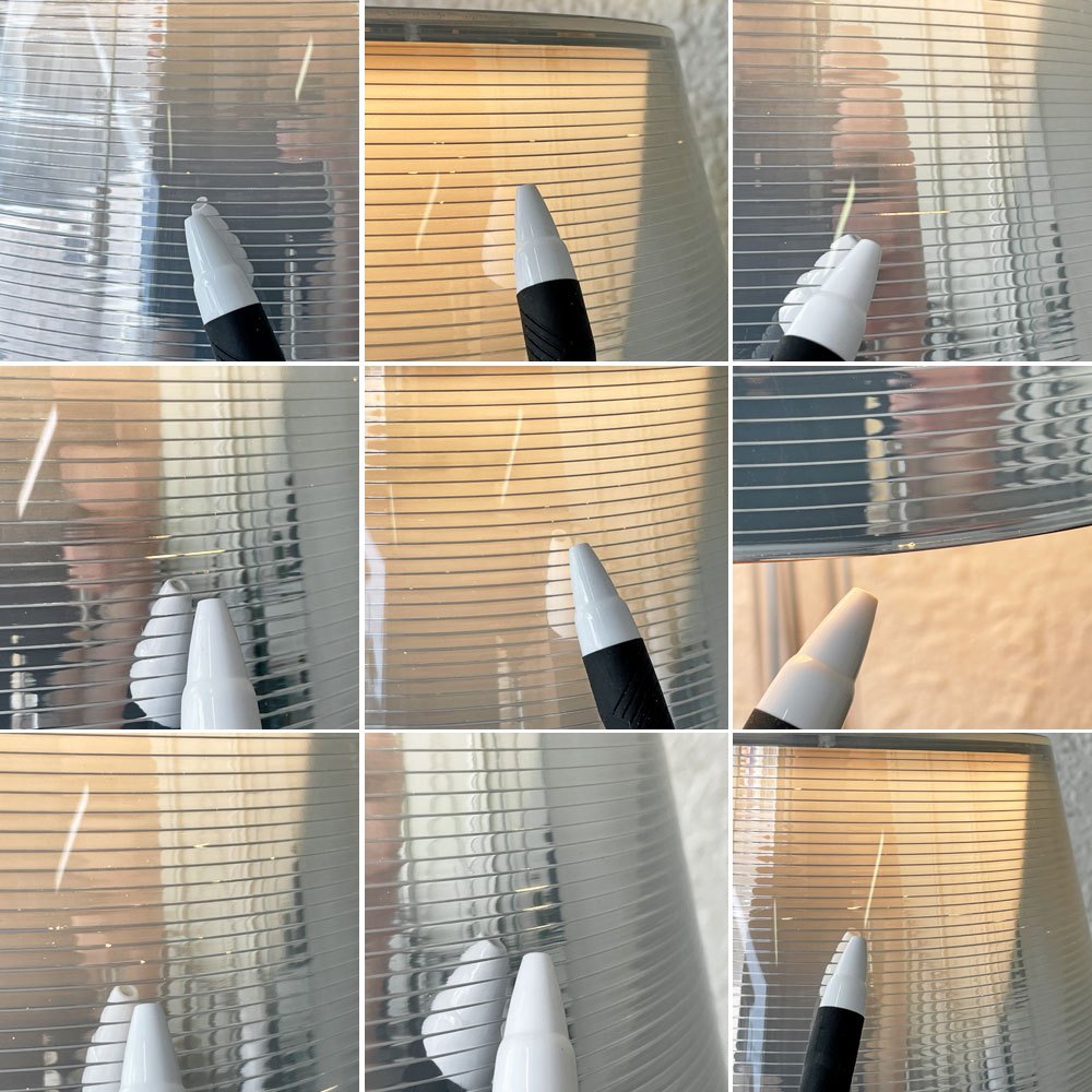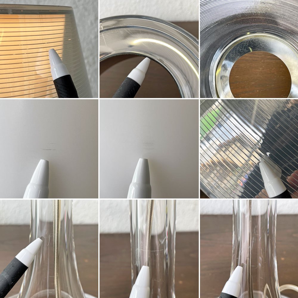 使用に伴う擦れ傷の他、うっすらとした線傷やスクラッチ、シェード内側メッキの細かな剥がれが散見されまたわずかに白濁しているように感じられますが、いずれも大きく風合いを損なうものでは無くご使用に問題となるものではございません。点灯にも問題は無く、引き続きデザインを楽しみながらお使い頂ける、USED品として概ね良好なコンディションを保っております。