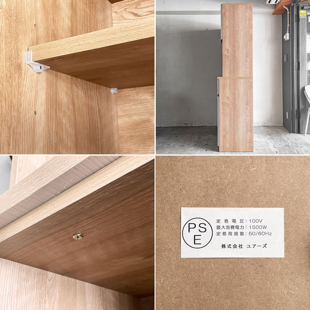 開き扉やスライド棚、中央のオープンスペースと幅広い収納機能を実現。