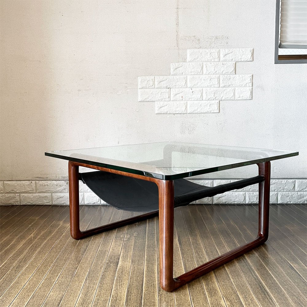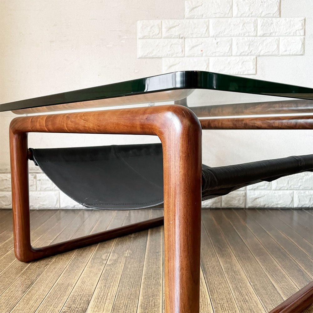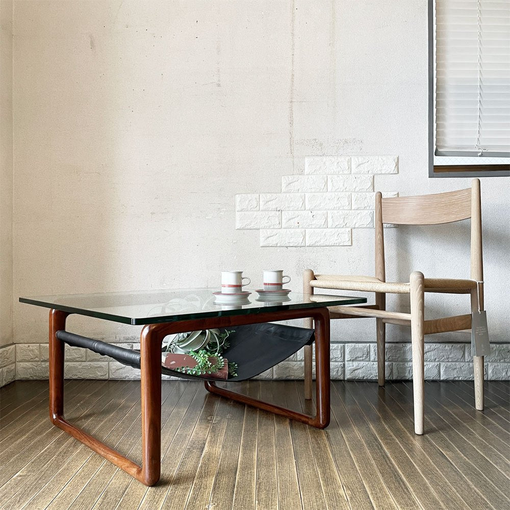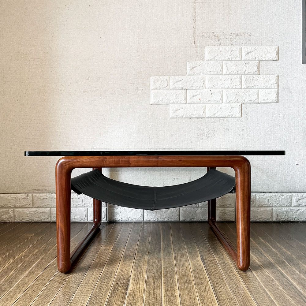 ケンオクヤマデザイン KEN OKUYAMA DESIGN ハンモック リビングテーブル ローテーブル ガラス×ウォールナット×ブラックレザー W80cm 奥山清行 定価¥99,800- 廃番 ~その贅沢は味方~