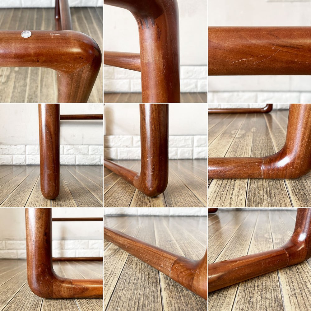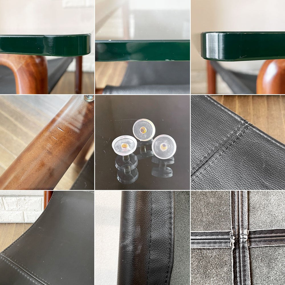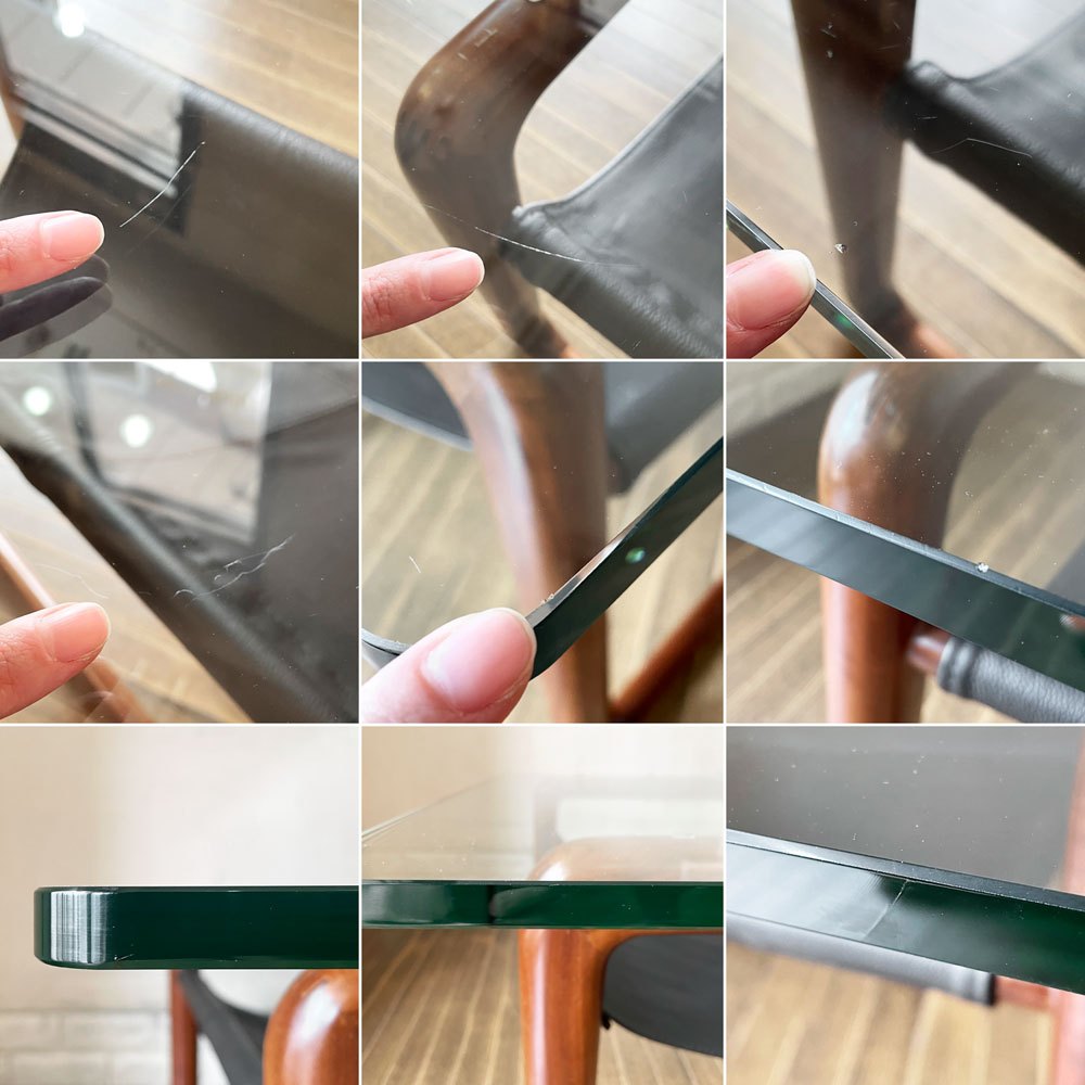 ガラス天板には擦れや傷、縁の削れ、複数の小さなチップや製造痕等が見受けられるとともに、オリジナルの滑り止めゴムが1点欠品していたため代替品を取り付けております(3点のみとなりますがオリジナルゴムもご一緒にお渡しいたします)。また、レザーにはくすみ汚れ、擦れや削れ、裏面の毛羽立ちやヨレによるシワなどがございます。その他、フレームには擦れや傷、打痕、色落ち、底裏の削れが散見されますが、ご使用に支障をきたすがたつきやぐらつきといったダメージはございません。今後も安心して実用いただけるコンディションを保っております。