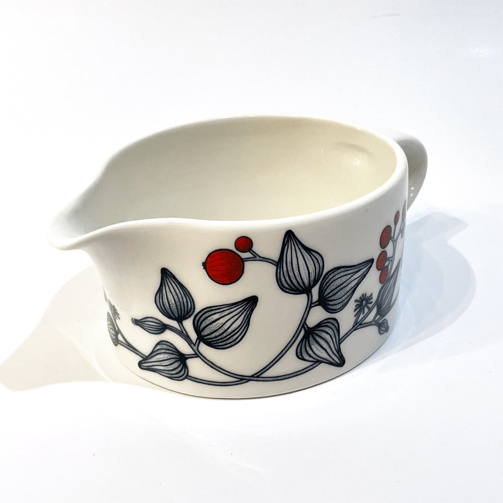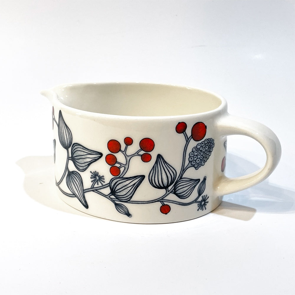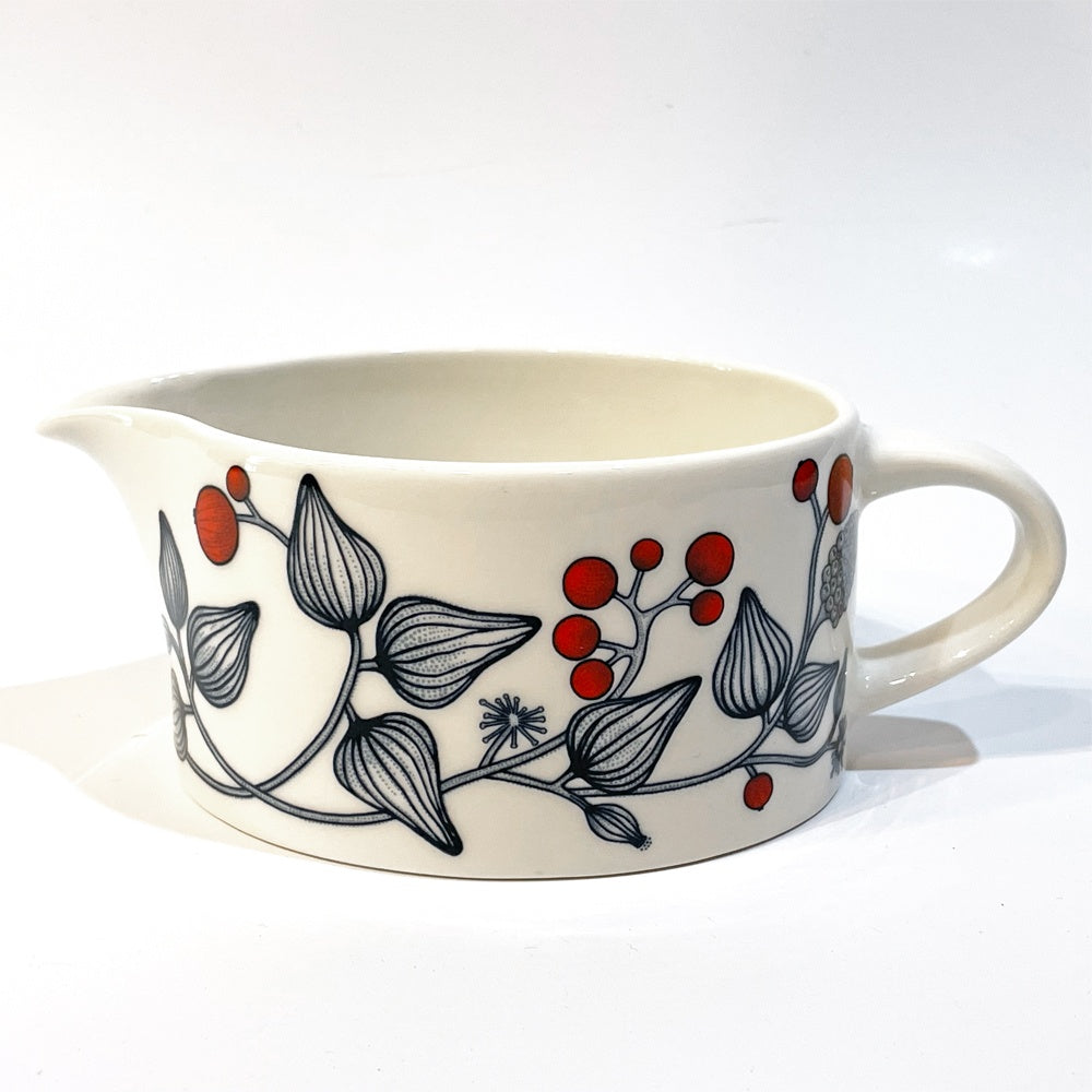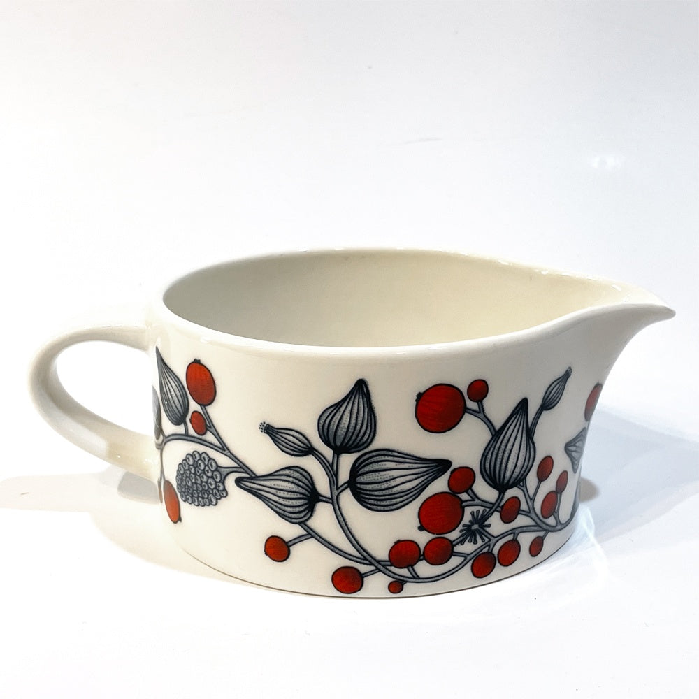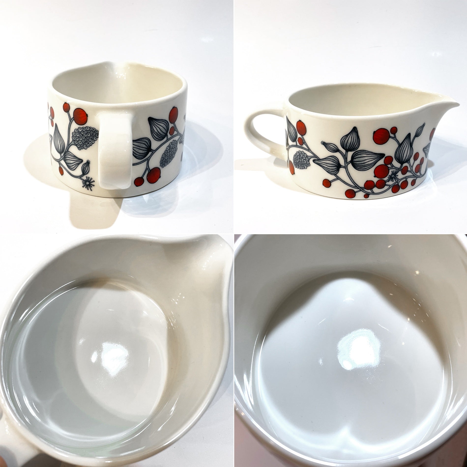 アラビア ARABIAの150周年の記念ロゴを排した『ルノ RUNO』のフロストベリーピッチャー となります。‹br› 内容量は約400mlとバターやソース、ジャムなど何にでも流用できる便利なサイズ。‹br› いつもの食卓を明るくエレガントに演出する容器として最適なフロストベリーパターン。‹br› ‹br› RUNOはフィンランド語で《詩》を意味し、こちらは雪の中で真っ赤な実を付けたフロストベリー。‹br› ‹br› オリジナルは2010~2011年の極短い期間にのみ製造され、こちらは2020年スコープより復刻されたもの。‹br› しかし復刻も現在では廃盤となっており、大変希少な逸品と言えます。‹br›