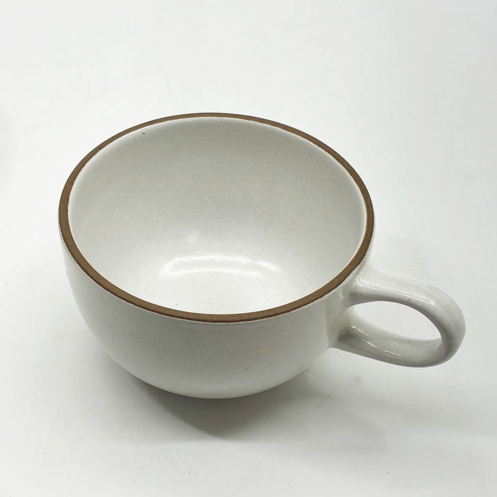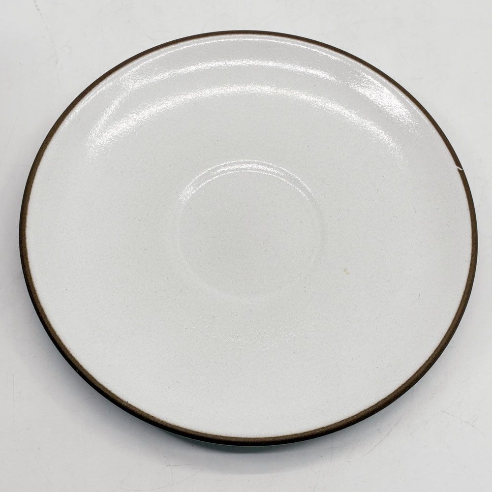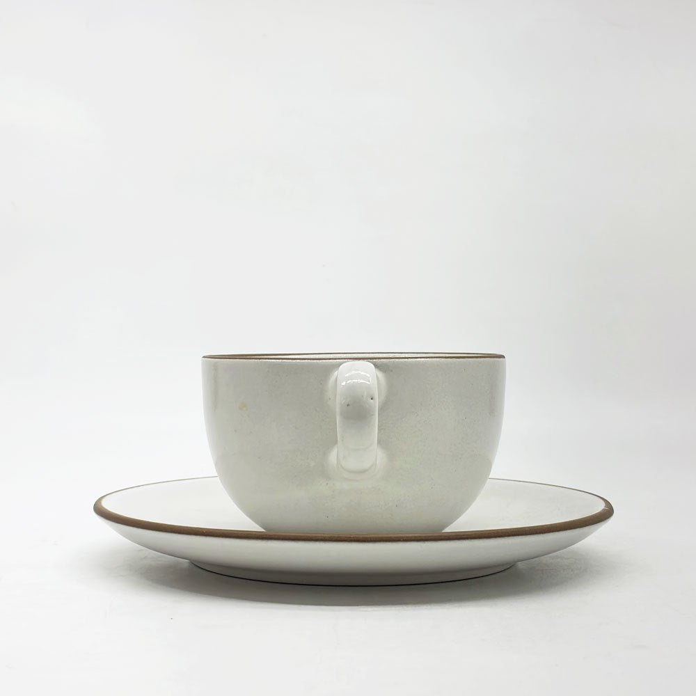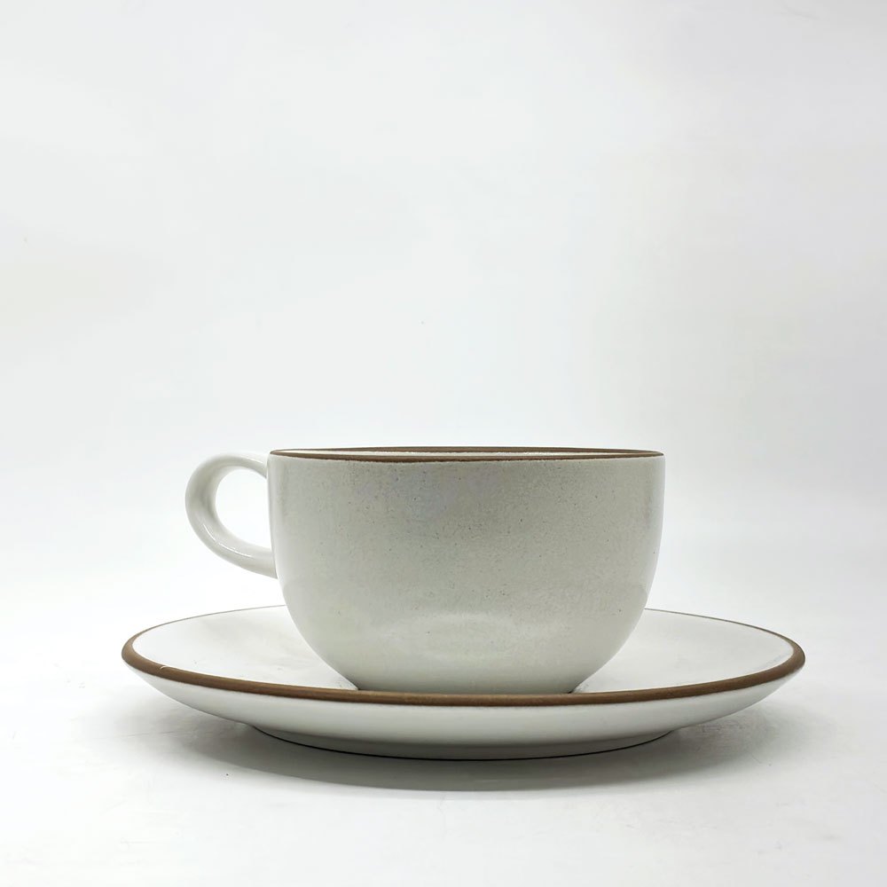 黒い粒が混ざった味わいのある色合いに、カップ・ソーサーの縁にアクセントとなるブラウンカラーのラインが入った一品です。