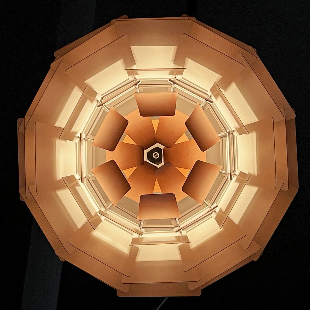 12列に6枚づつ正確に配置された72枚の羽根は、内部の電球を光らせる事でそれぞれの羽根の内側が光を反射して下のシェードを照らし、器具全体を照らします。これにより刺激のある光はカットされており、温かみのある柔らかな光を空間に届けます。