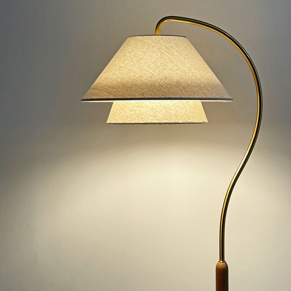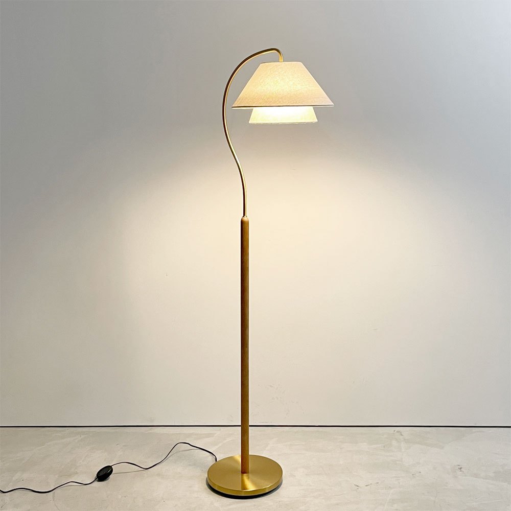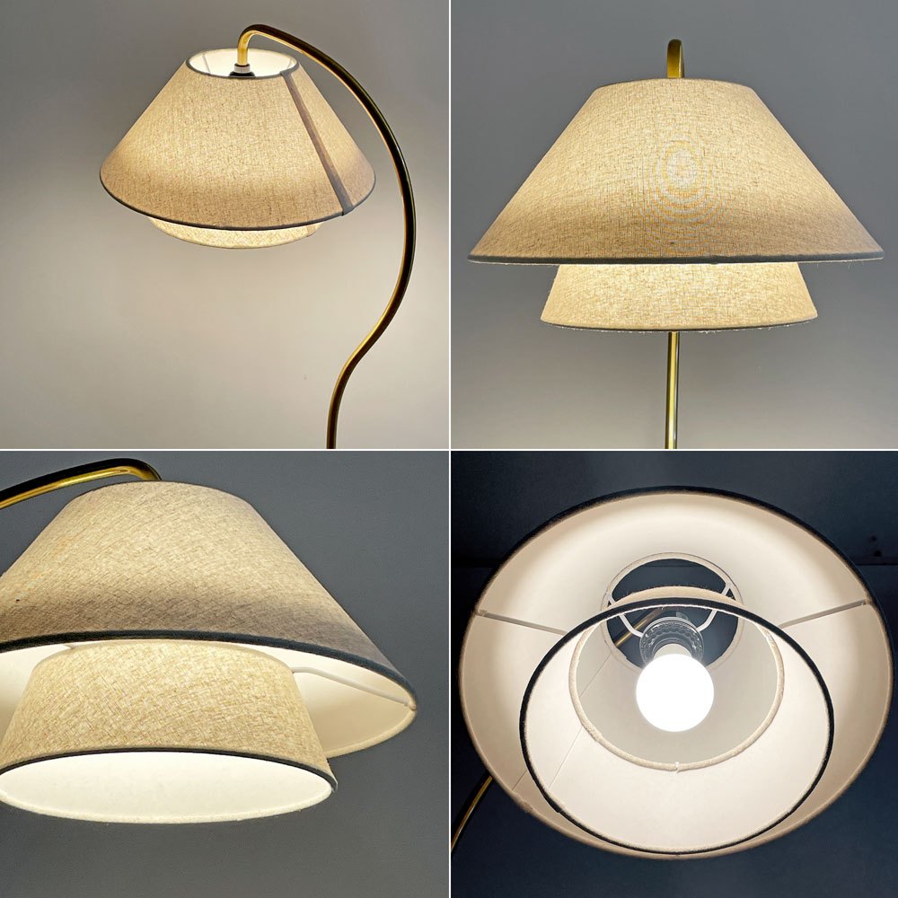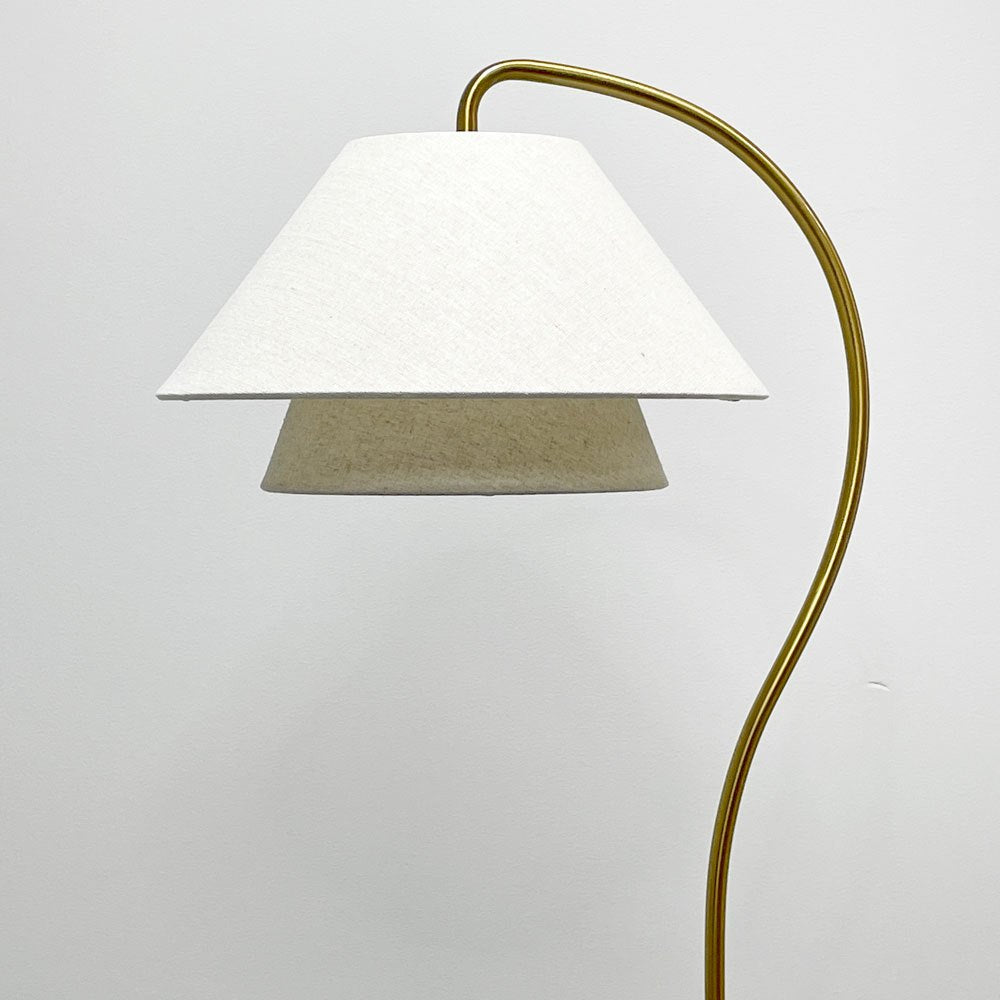 シェードにかけて伸びるアームはスワンネックを想わせる優美なラインで、2枚仕立てのファブリックシェードが空間を優しく灯します。