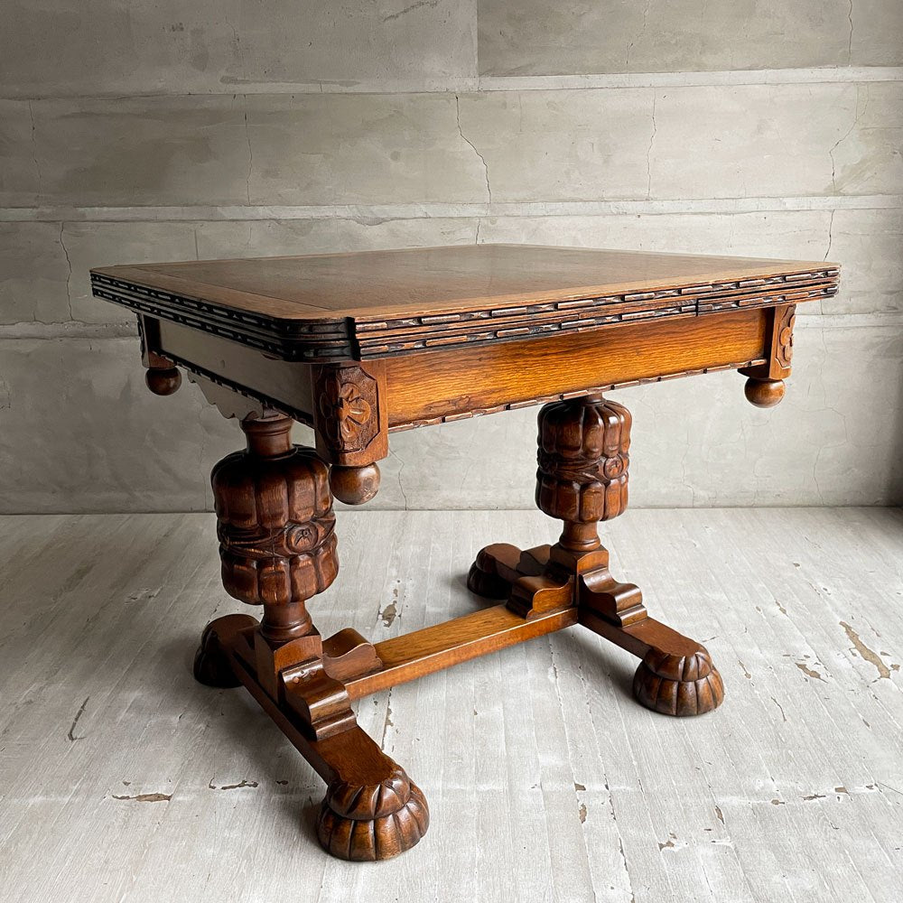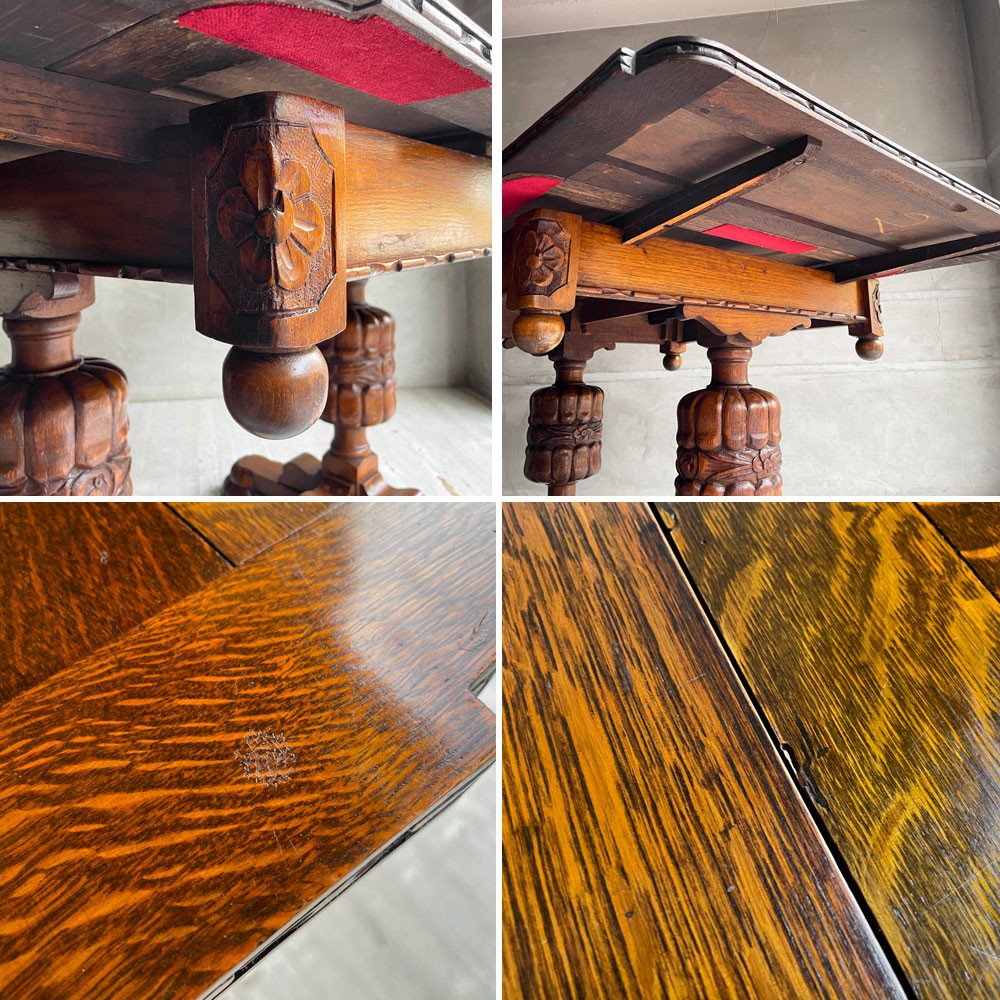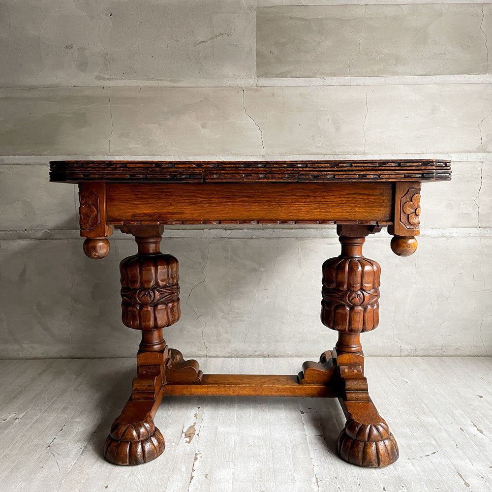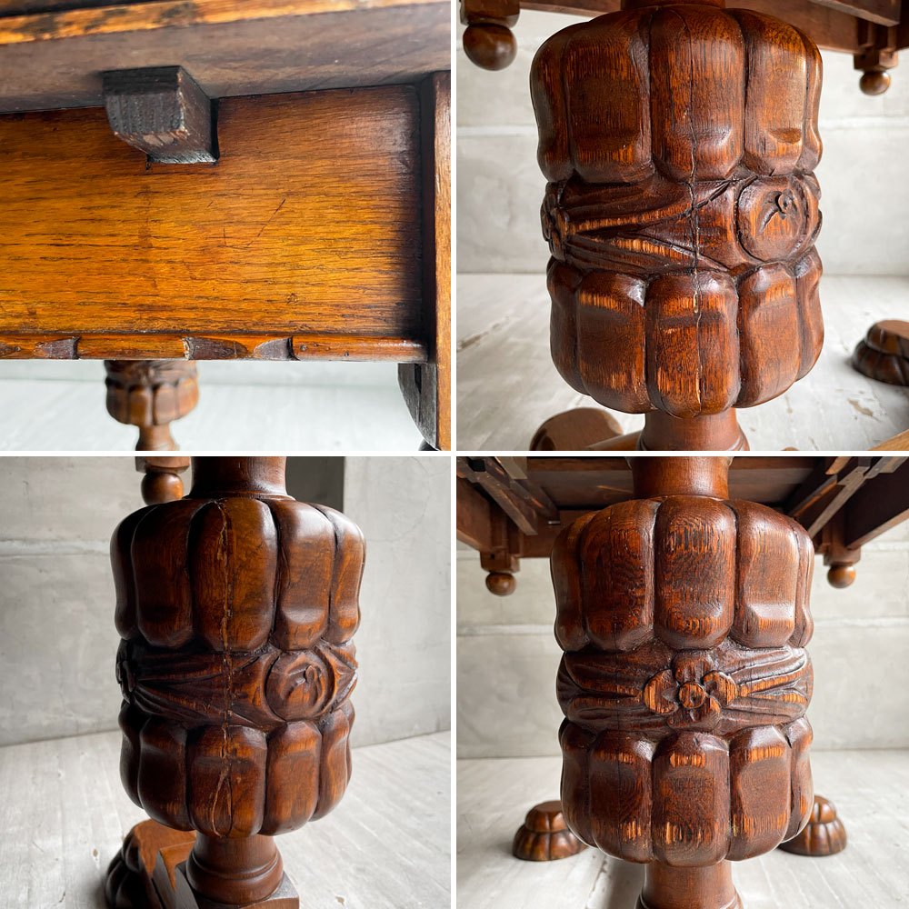 バルボスレッグと呼ばれる球根のように膨らんだ装飾の脚部が特徴的であり、天板の側面や天板下の貫部分、レッグの支柱部分から脚先まで細かな装飾が施されており職人の確かな腕が垣間見えます。
