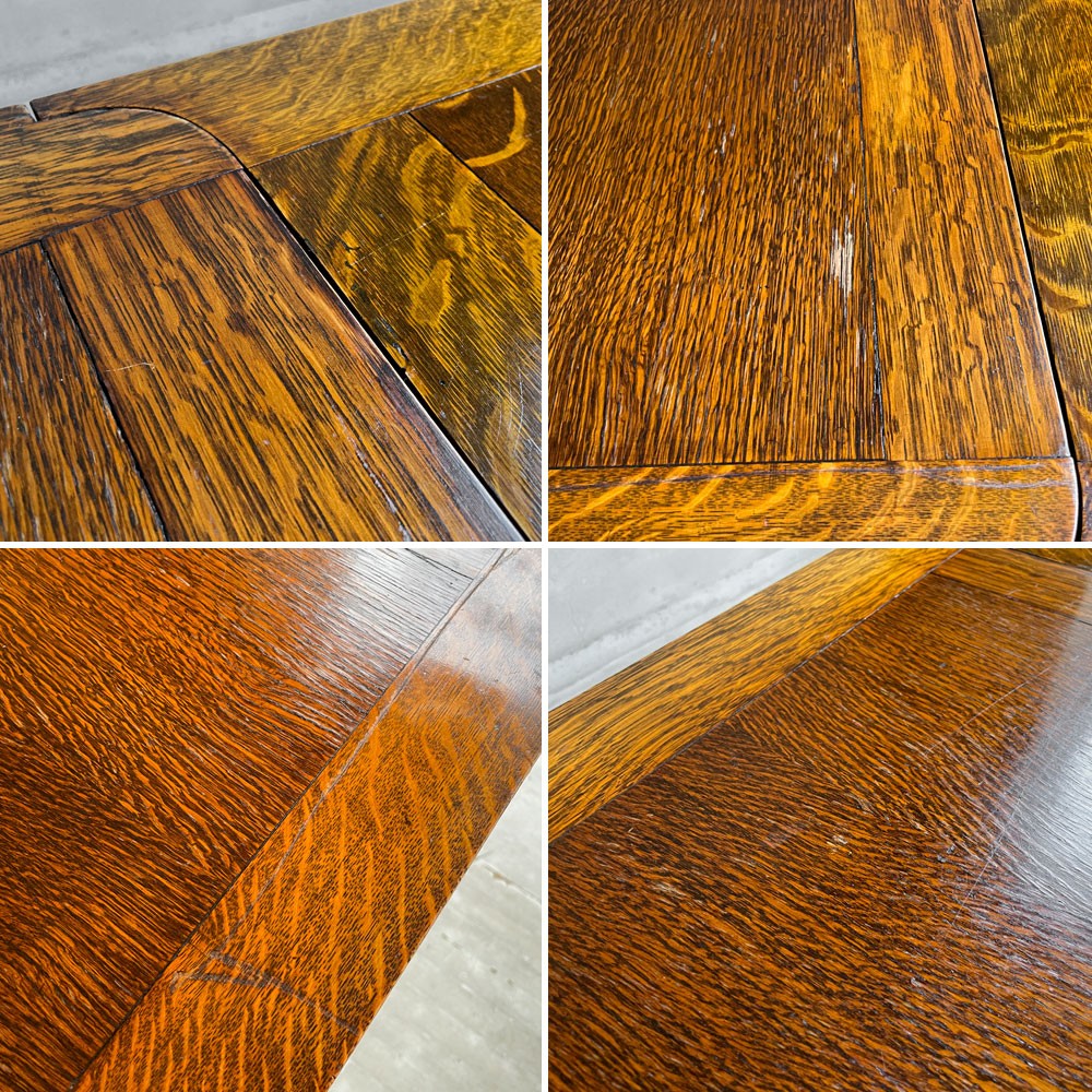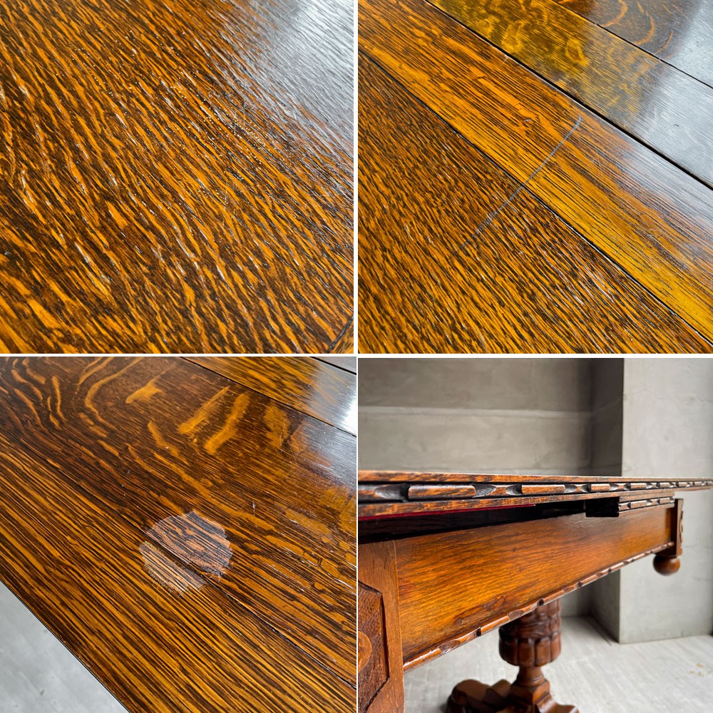 経年変化に伴うオーク材の深い色味と美しい光沢感に加え、天板にはっきりと表れた虎斑(トラフ)は質の良いオーク材が使われているのが一目でわかるサインでもあり、高級感を感じさせます。