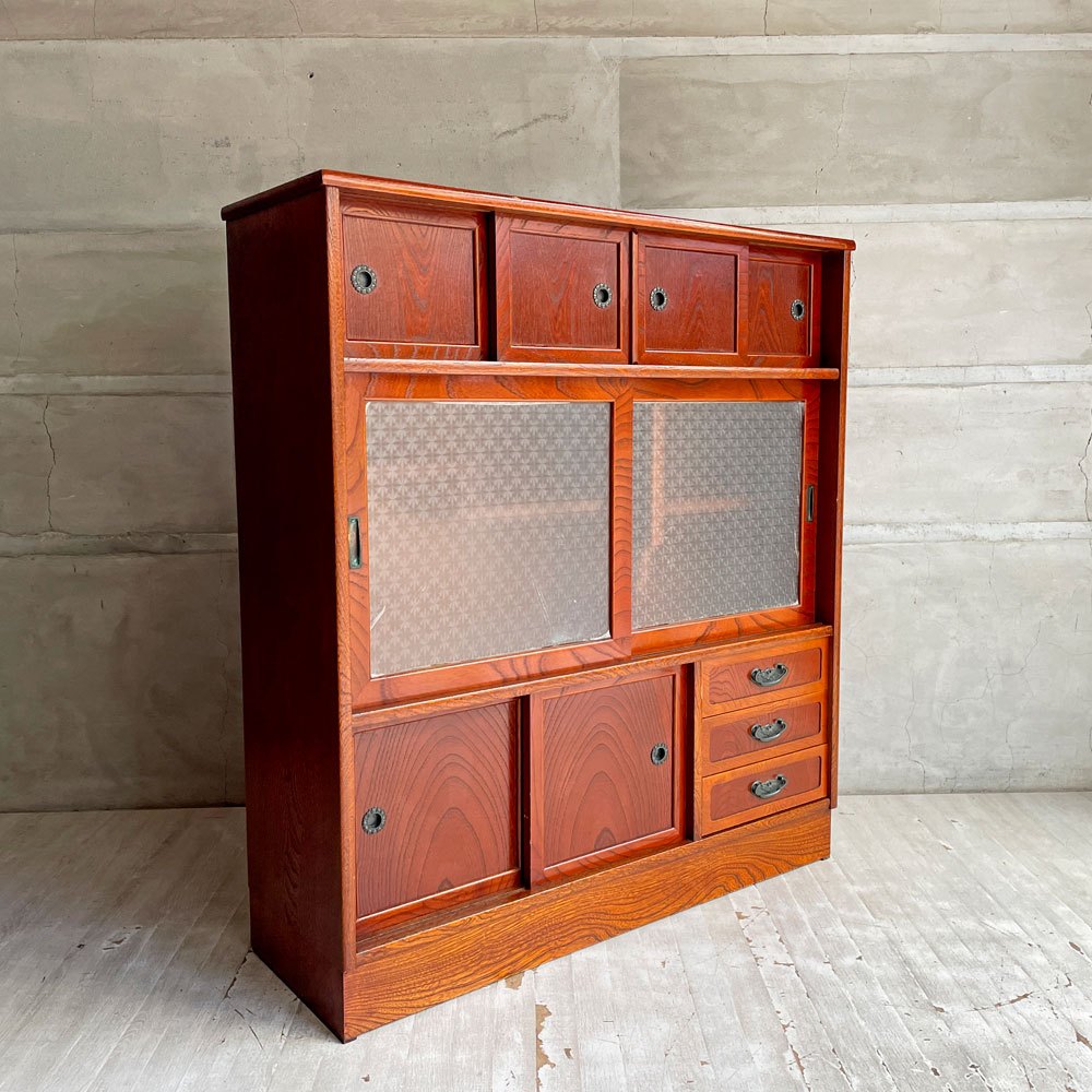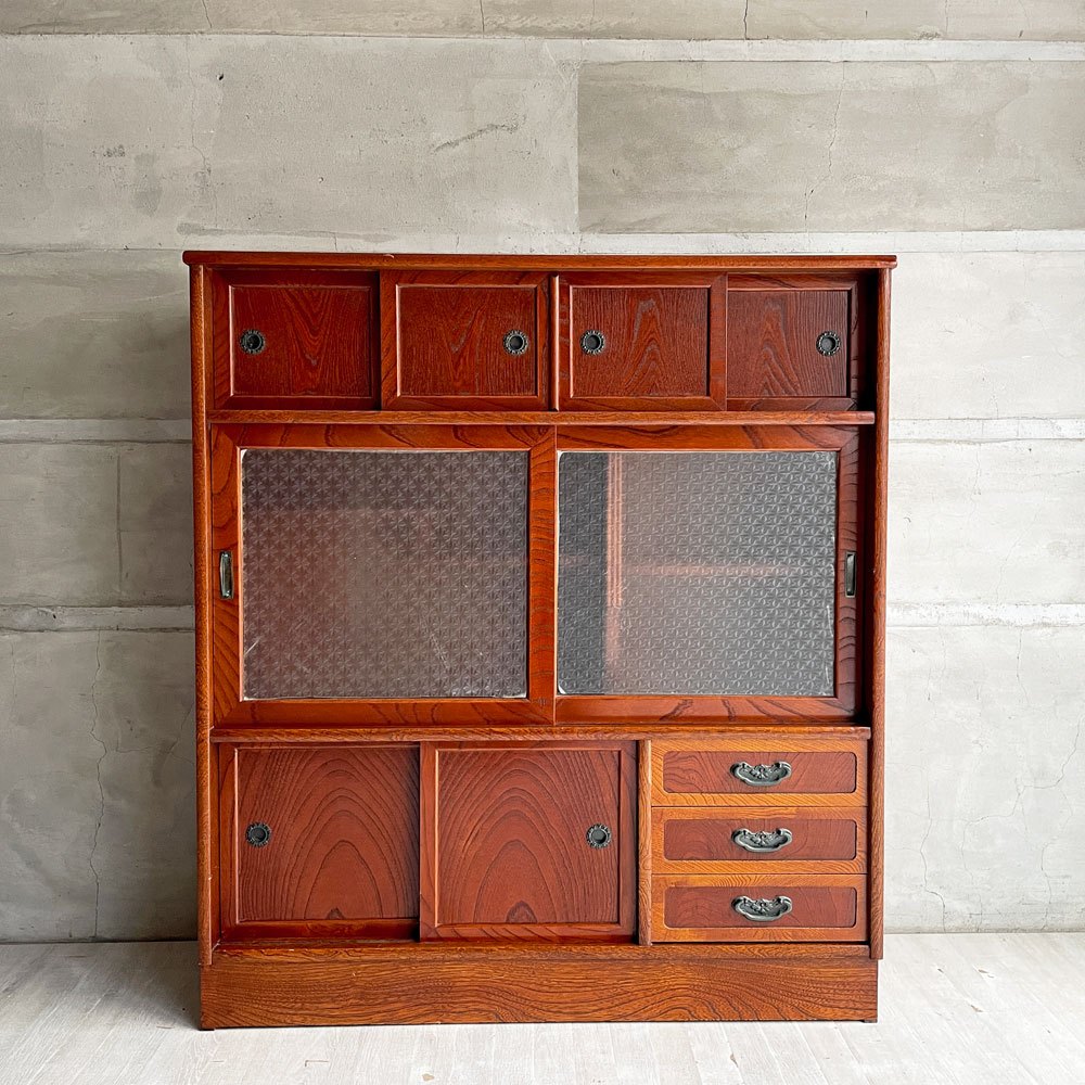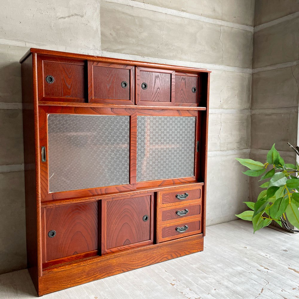 ジャパンビンテージ Japan Vintage 茶箪笥 食器棚 ガラス戸 抽斗 欅材 レトロ 古家具 和家具 ♪