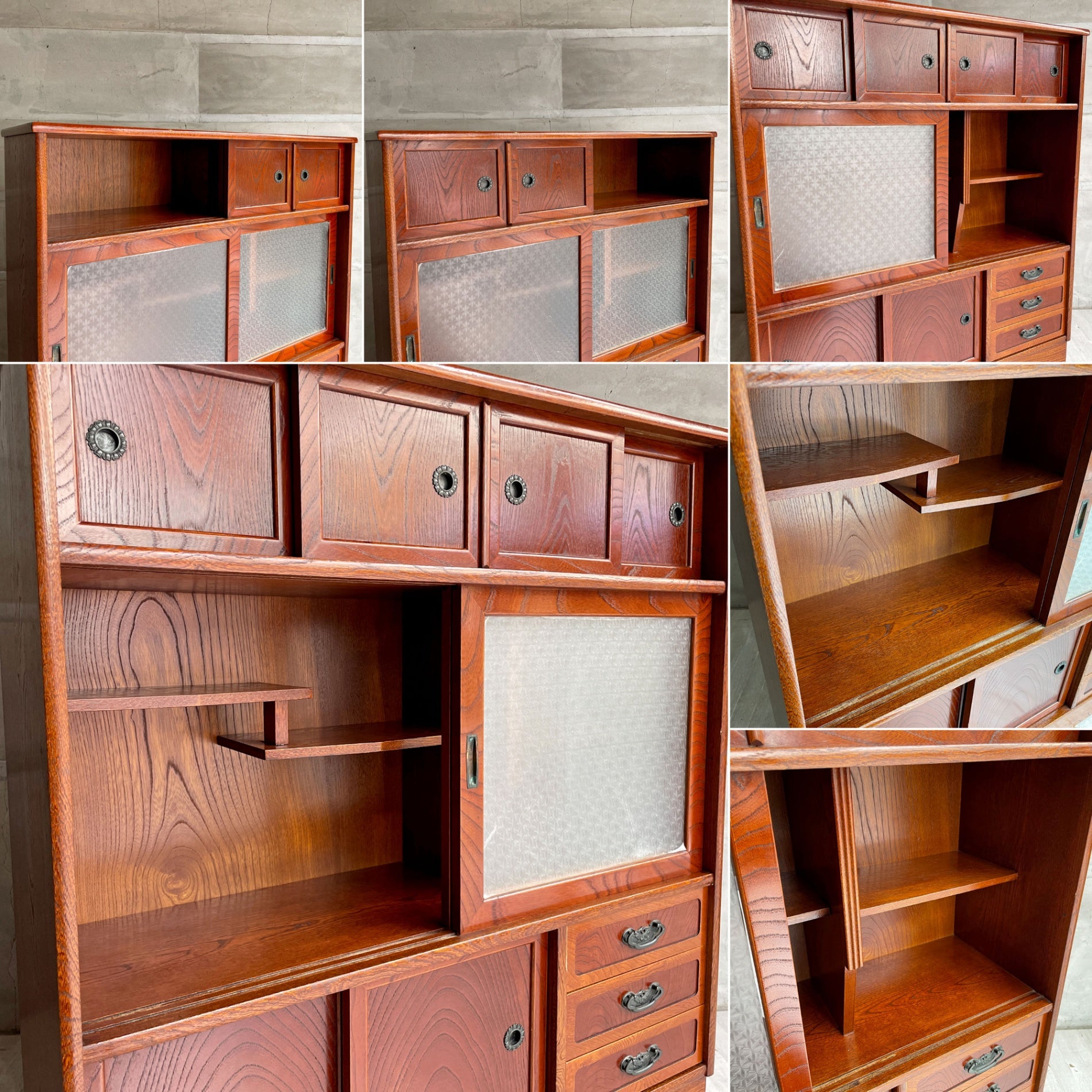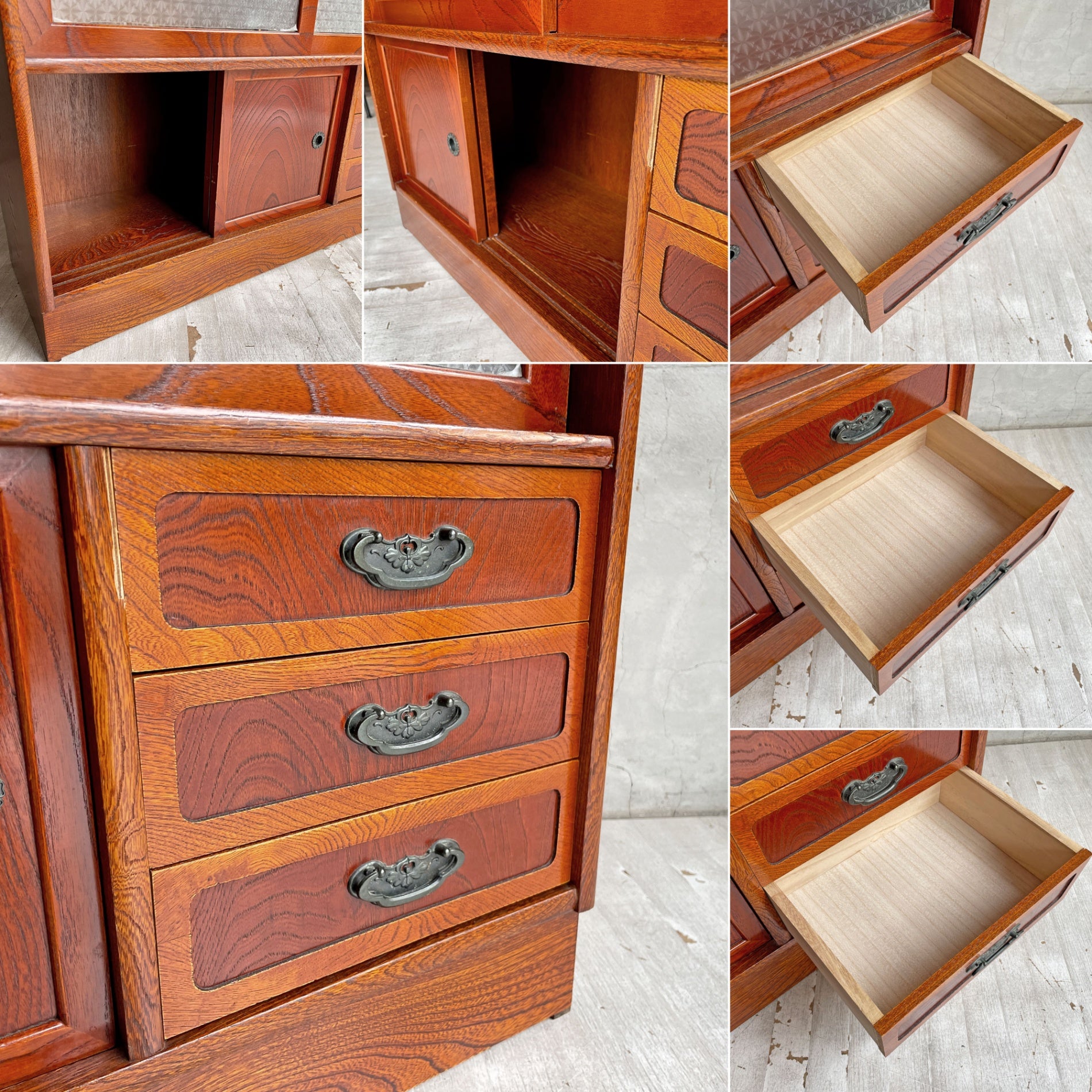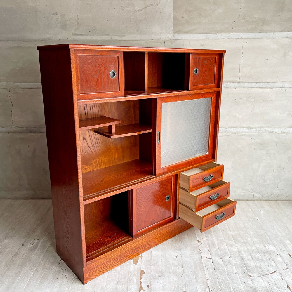 ジャパンビンテージ Japan Vintage 茶箪笥 食器棚 ガラス戸 抽斗 欅材 レトロ 古家具 和家具 ♪