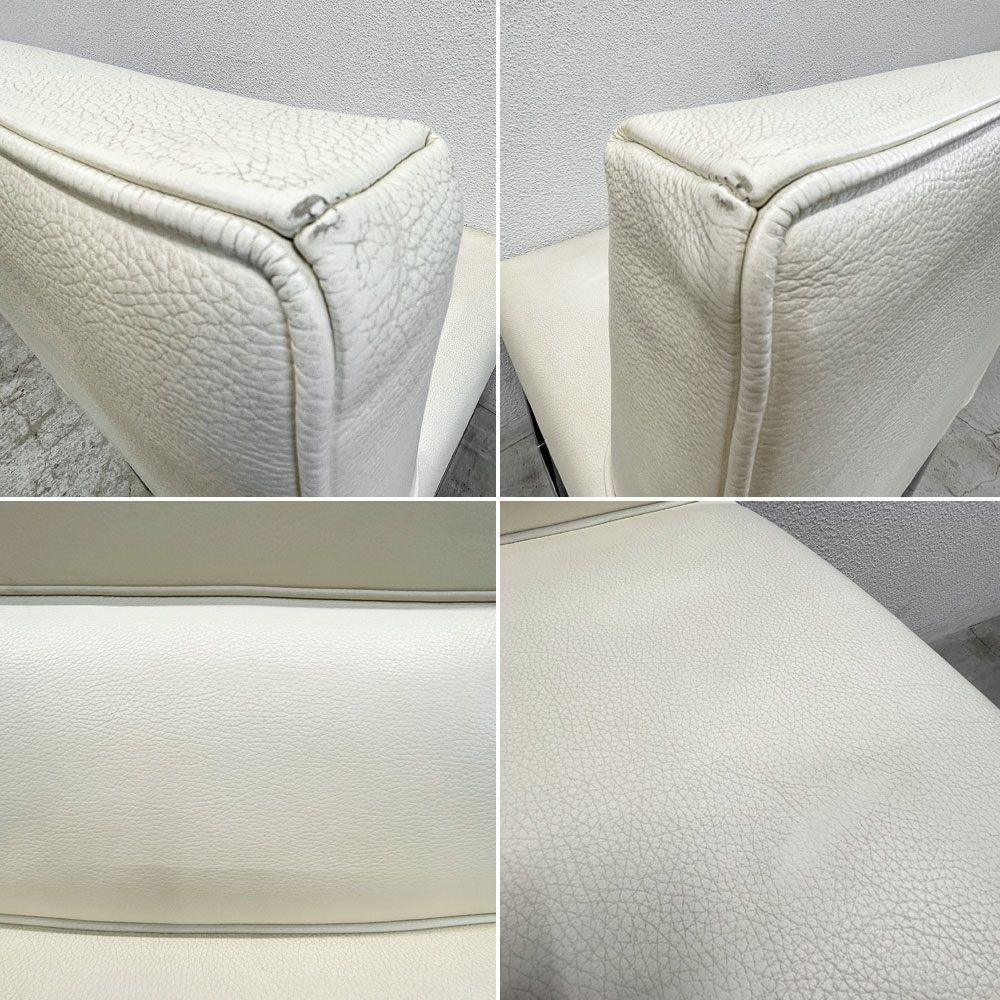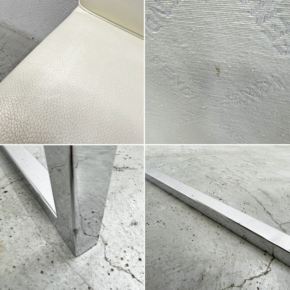少々擦れや僅かな小傷、元々オフホワイト色ですが、シートには一見では判らない程度のヤケ、シボに入った薄汚れ、脚部に若干のクスミ等が見受けられます。画像の通り大きく目立ったダメージは無く、シートの張りも健在です。コンディションの表現には幾分主観を含む為、画像や記述をよくご確認頂きご検討下さい。イメージサンプルとしてテーブルや照明、小物等が写っておりますが、販売対象はチェア1脚のみとなります。