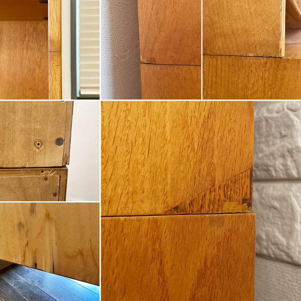 こちらは、ビンテージのお品物となります。使用・経年に伴い、傷や擦れ、打痕や色ムラ、ペイントロスや染み、落としきれない汚れや黒ずみ、背面にテープ痕、金属部の錆やクスミがございます。また、一部突板の剥がれに加え、パテや突板による補修痕がございます。その他、実用に問題となるダメージは無く、ビンテージ品として概ね良好なコンディションを保っております。