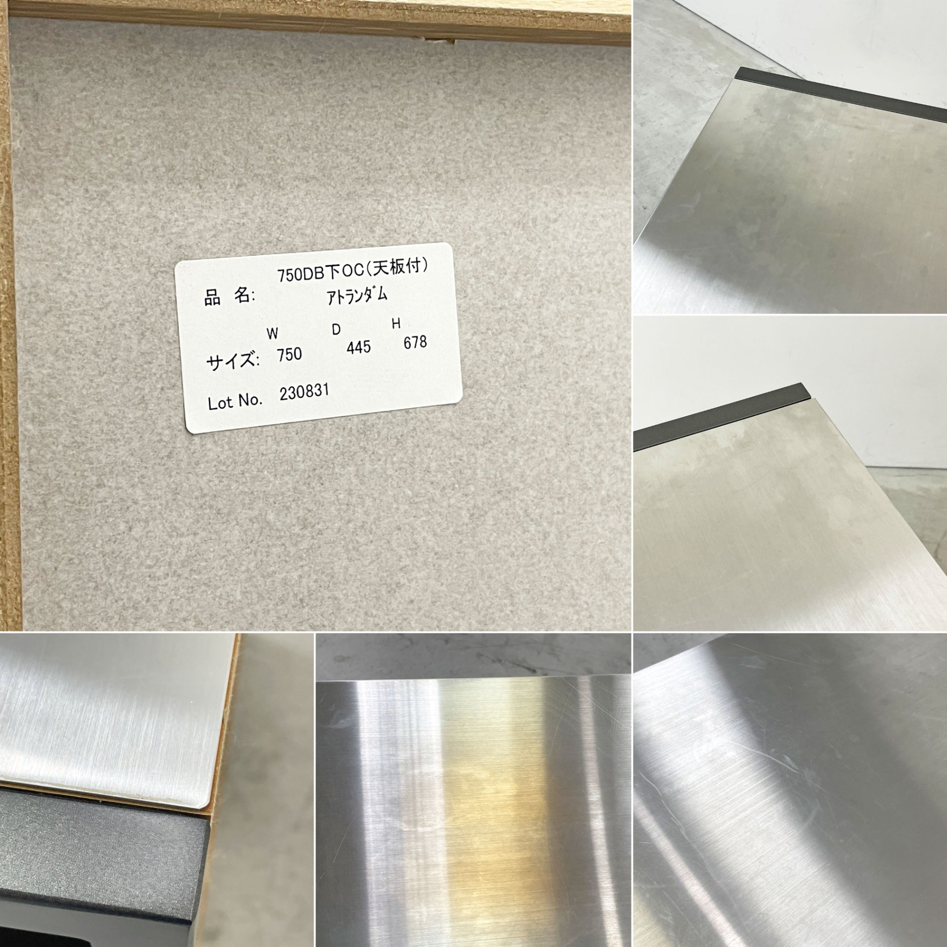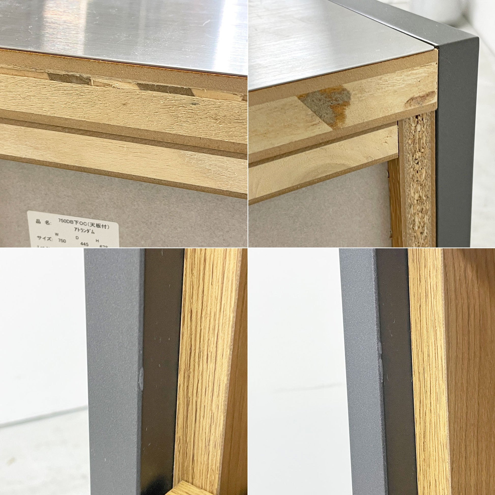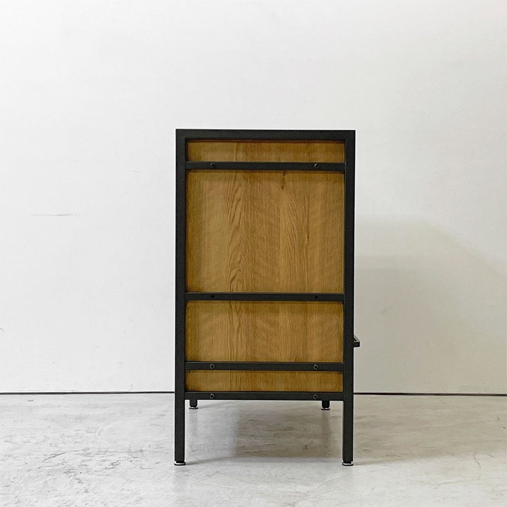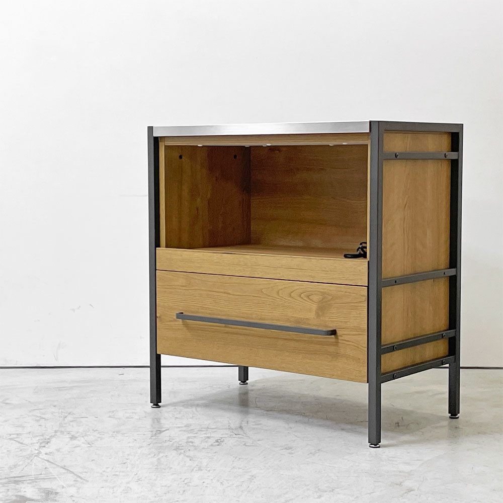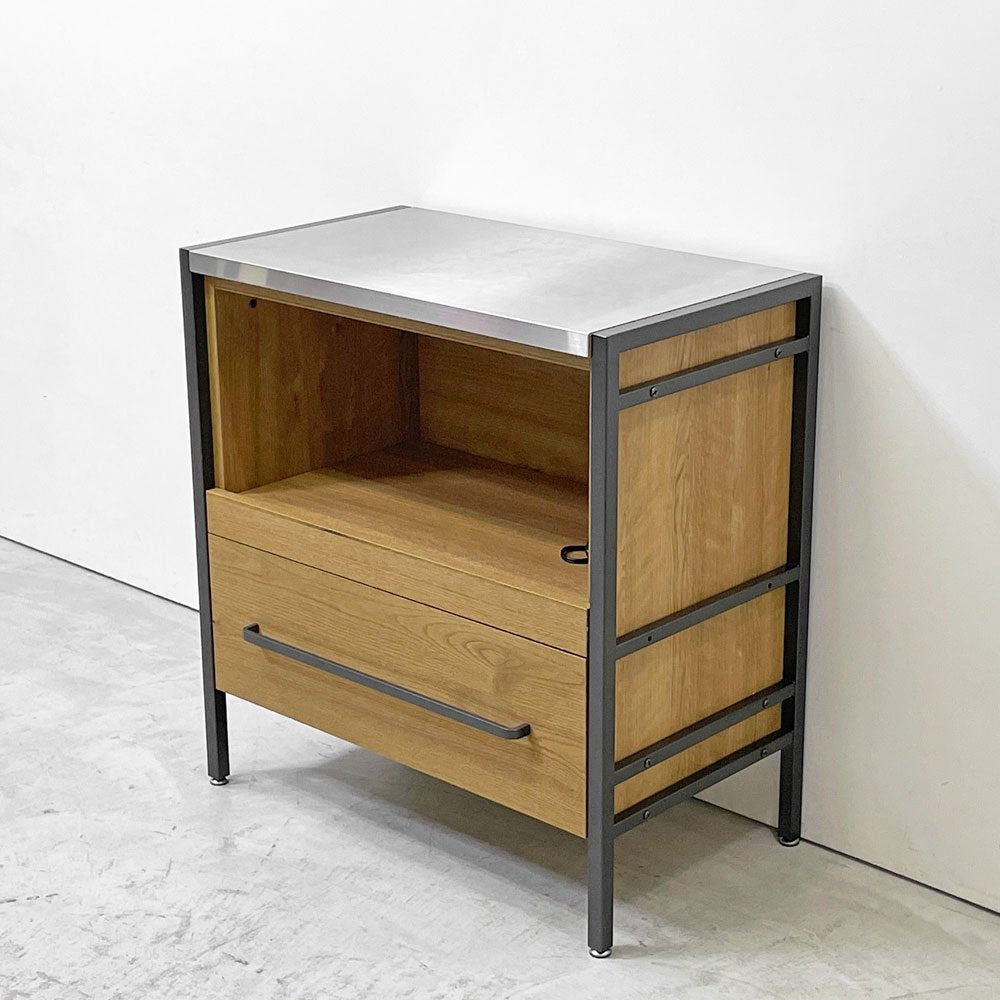 オーク材突板の杢目の表情に対して無機質なスチールフレームがメリハリを効かせ、シックで大人びた空間演出。また天板上は汚れに強いステンレスが使用され、キッチン周りでのご使用に最適です。