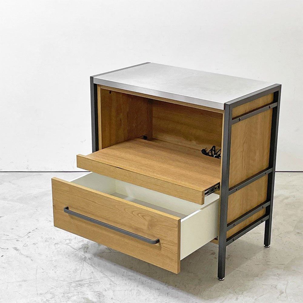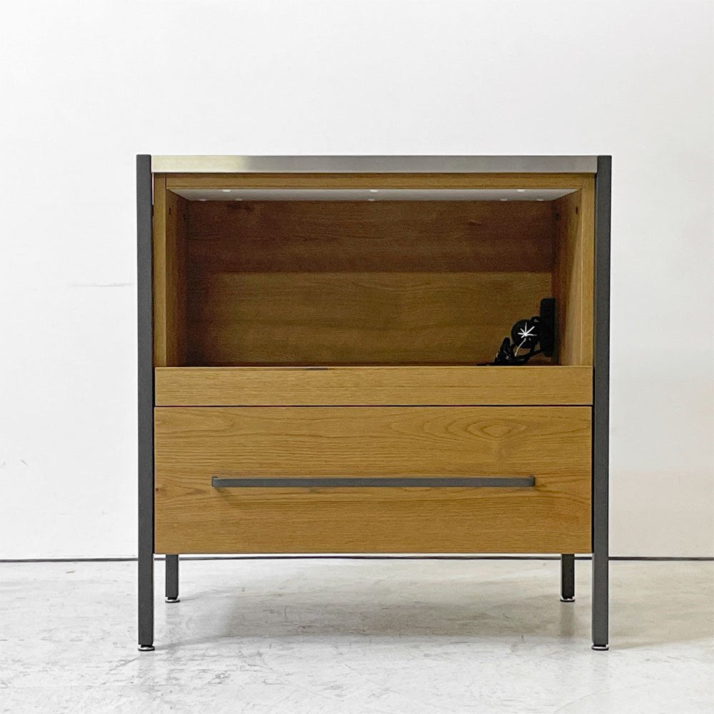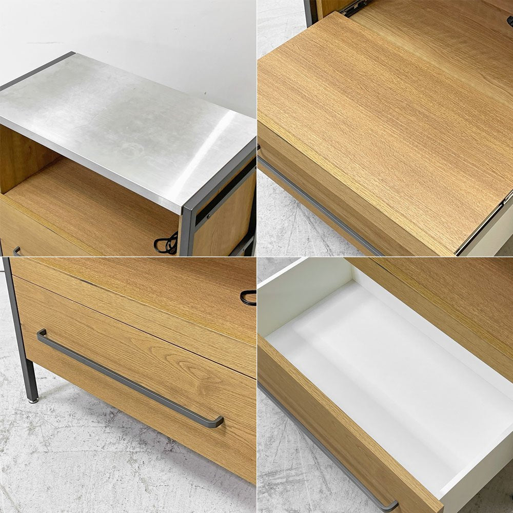 幅広いバリエーションで展開する同シリーズのユニットキャビネットは自由に組み合わせながら家具の構築が可能となっており、こちらは1ドロワーの収納と、内部電源付きのスライドボードを備えたオープンシェルフ。