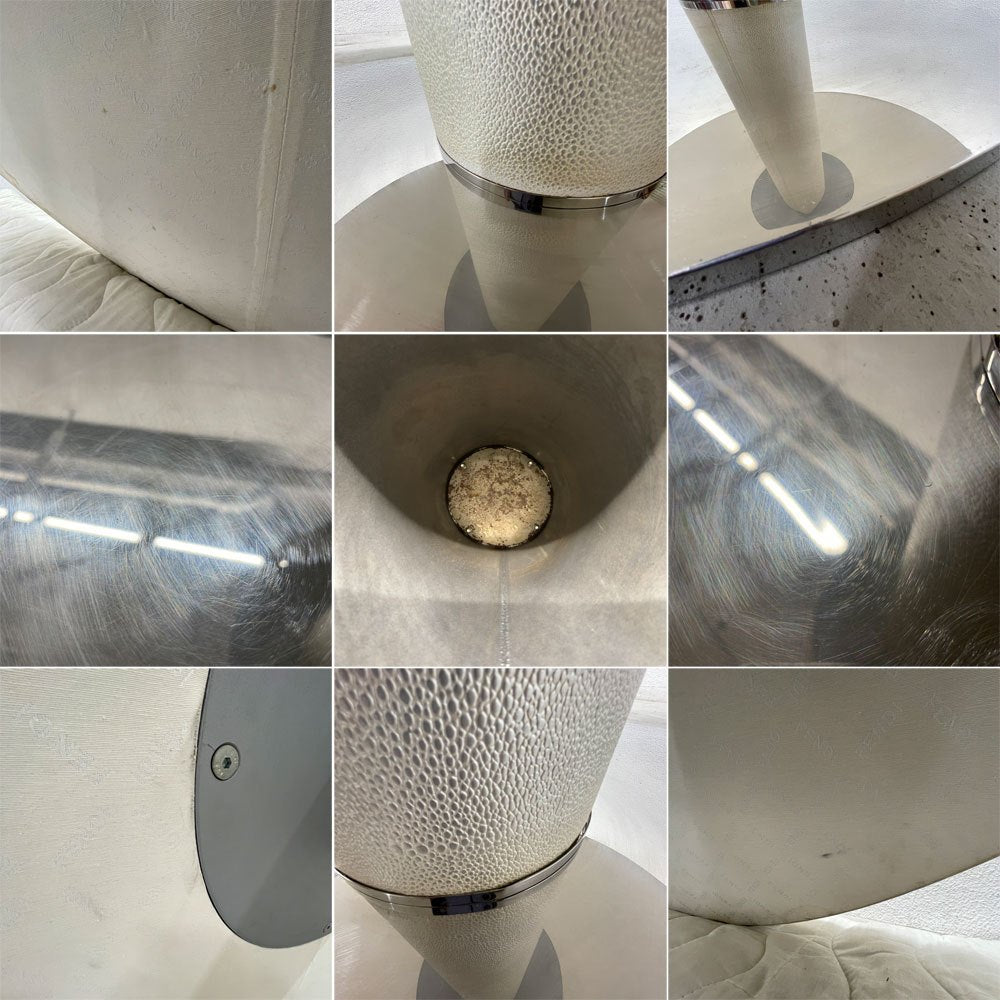 全体的な擦れやヤケによる多少の黄ばみ、天板角面の小さな打痕、補修済みですが天板面に一部V字の裂痕や小傷、ベースのステンレス部にサテン状のスクラッチ痕、スチール部に小傷によるペイントロス、普段見える場所ではないですが、支柱の筒内部の錆、支柱脚元の黄ばみや小傷等、見受けられます。通常使用に伴う不具合は御座いません。コンディションの表現には幾分主観を含む為、画像や記述をよくご確認頂きご検討下さい。イメージサンプルとしてチェアや照明、小物等が写っておりますが、販売対象はテーブルのみとなります。