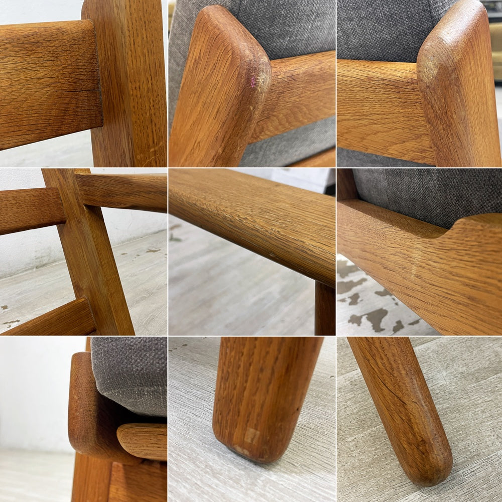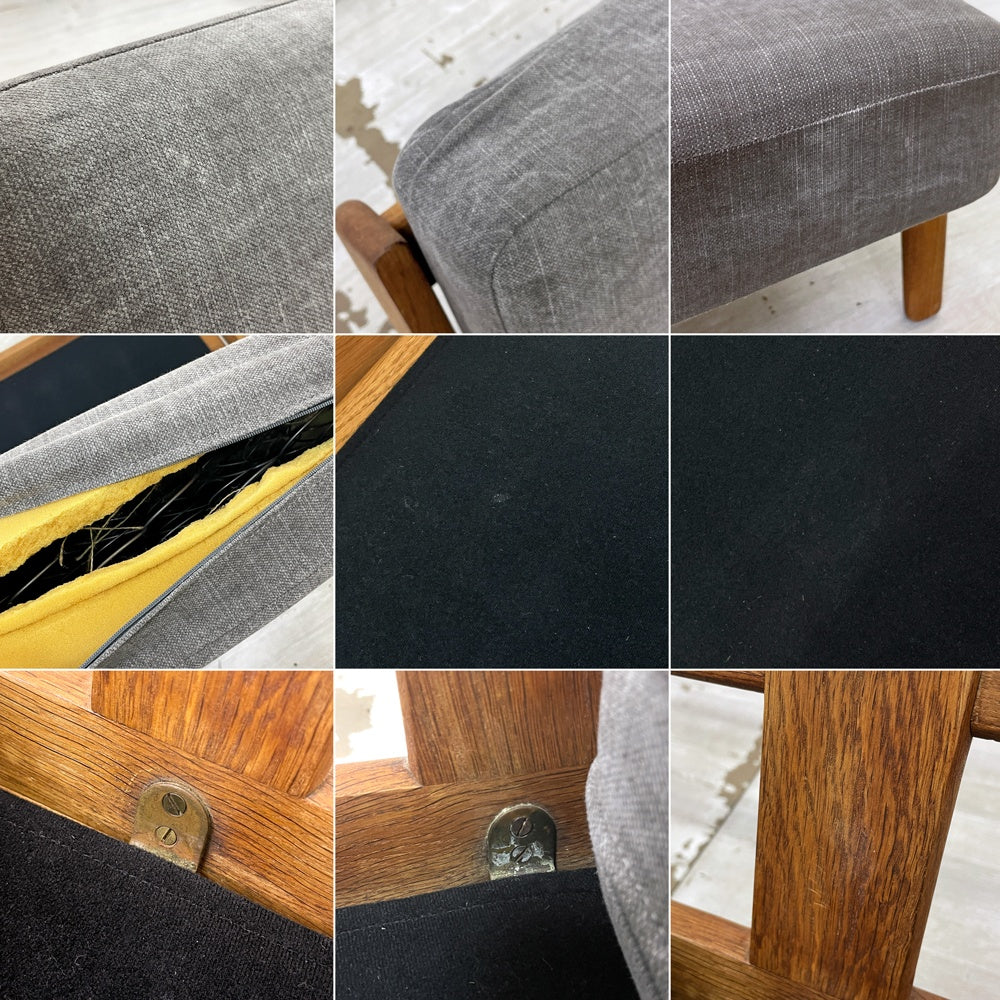 木部フレームには擦れや傷、打痕が散見され、所々にペイント痕が見られます。またファブリックにはシワ、極小さな取り切れない汚れが数箇所見られ、3つある座クッションのうち1つのみ、内部ウレタンクッションに破れが見られますが、着座の際に大きな違和感は感じられません。
