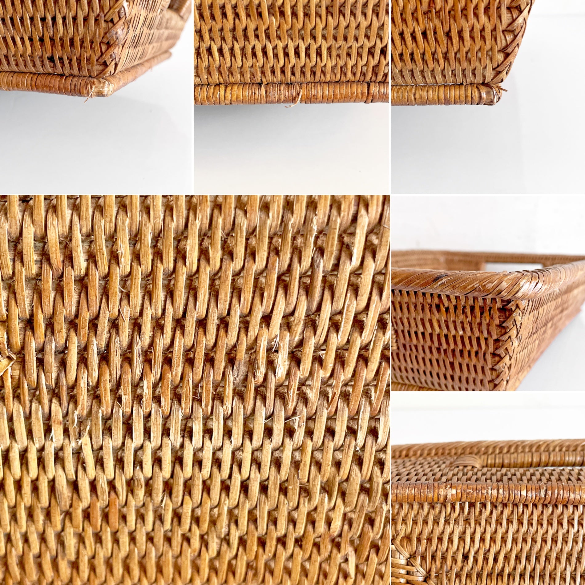 こちらは天然素材を使用したお品物です。若干の擦れや傷、黒ずみや取り切れない汚れ等が見受けられます。またわずかな蔓の千切れや割れ、ささくれなどがございますが、ご使用に支障となる大きなダメージは確認できません。風合いをお楽しみながらこれからも実用いただけます。
