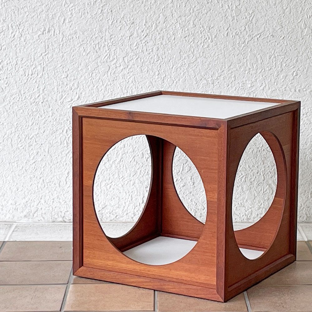 二葉家具 ビンテージ ハコテーブル チーク材 W40cm 原好輝 オープンシェルフ 自在家具 ミッドセンチュリーモダン 希少 ~丸い窓から広がる、棚にもなる名作テーブル~