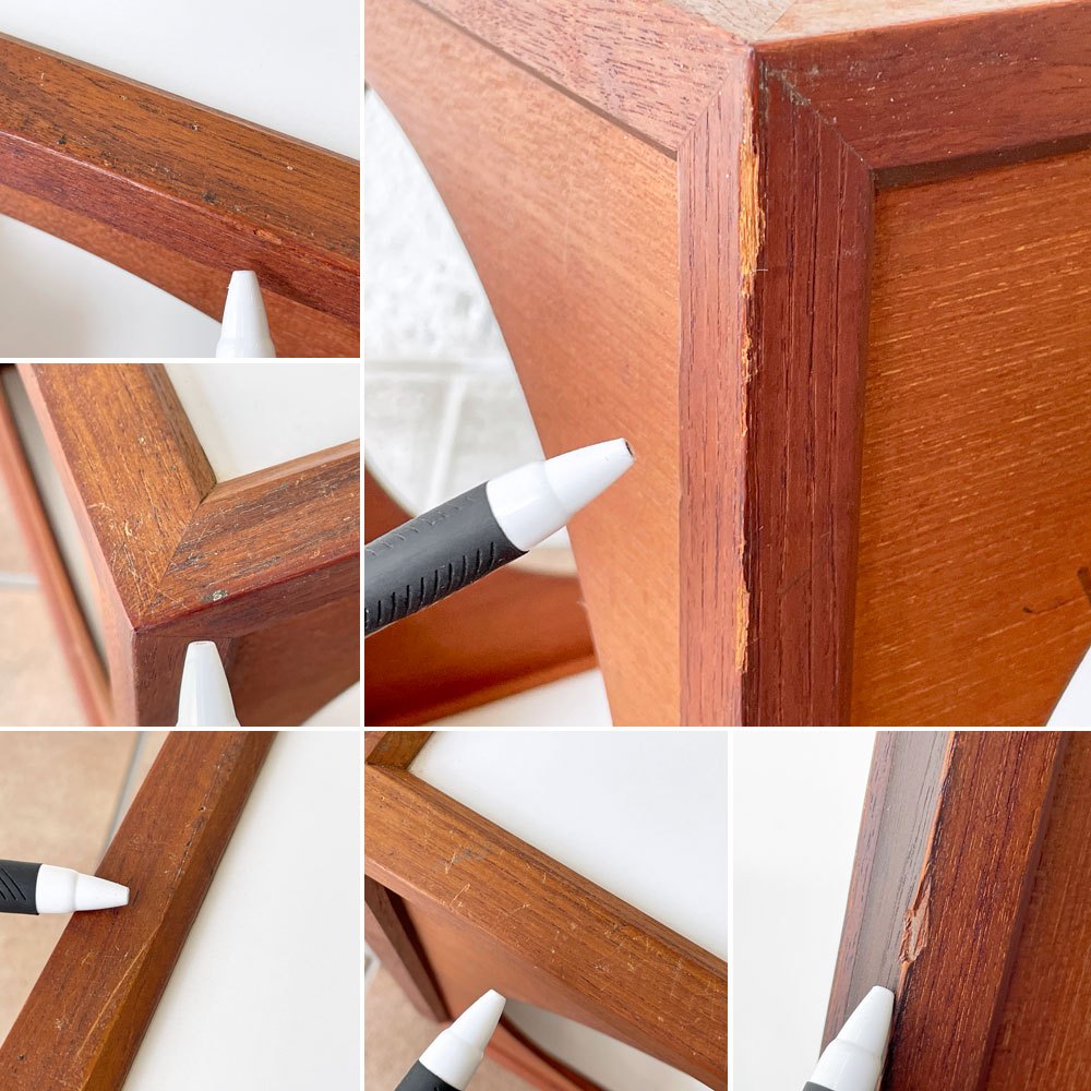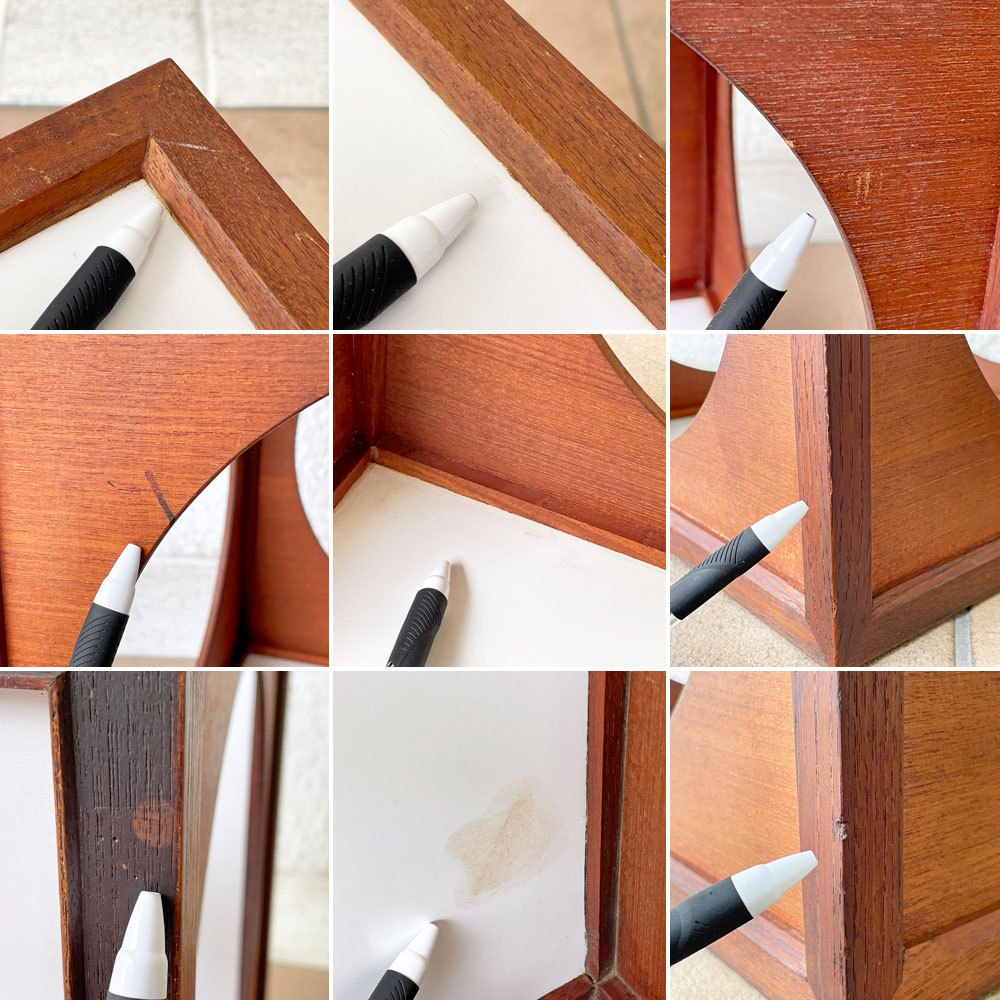 こちらはビンテージ品となります。使用に伴う擦れ傷の他、細かな打痕やスクラッチ、線傷、着色、フレーム底面の黒ずみ、メラミン天板の裏側の黄変等年月相応の使用感はございますが、いずれも大きく風合いを損なうものではございません。ご使用に問題となるダメージは無く、今後とも雰囲気を楽しみながらお使い頂ける、ビンテージ品として概ね良好なコンディションを保っております。
