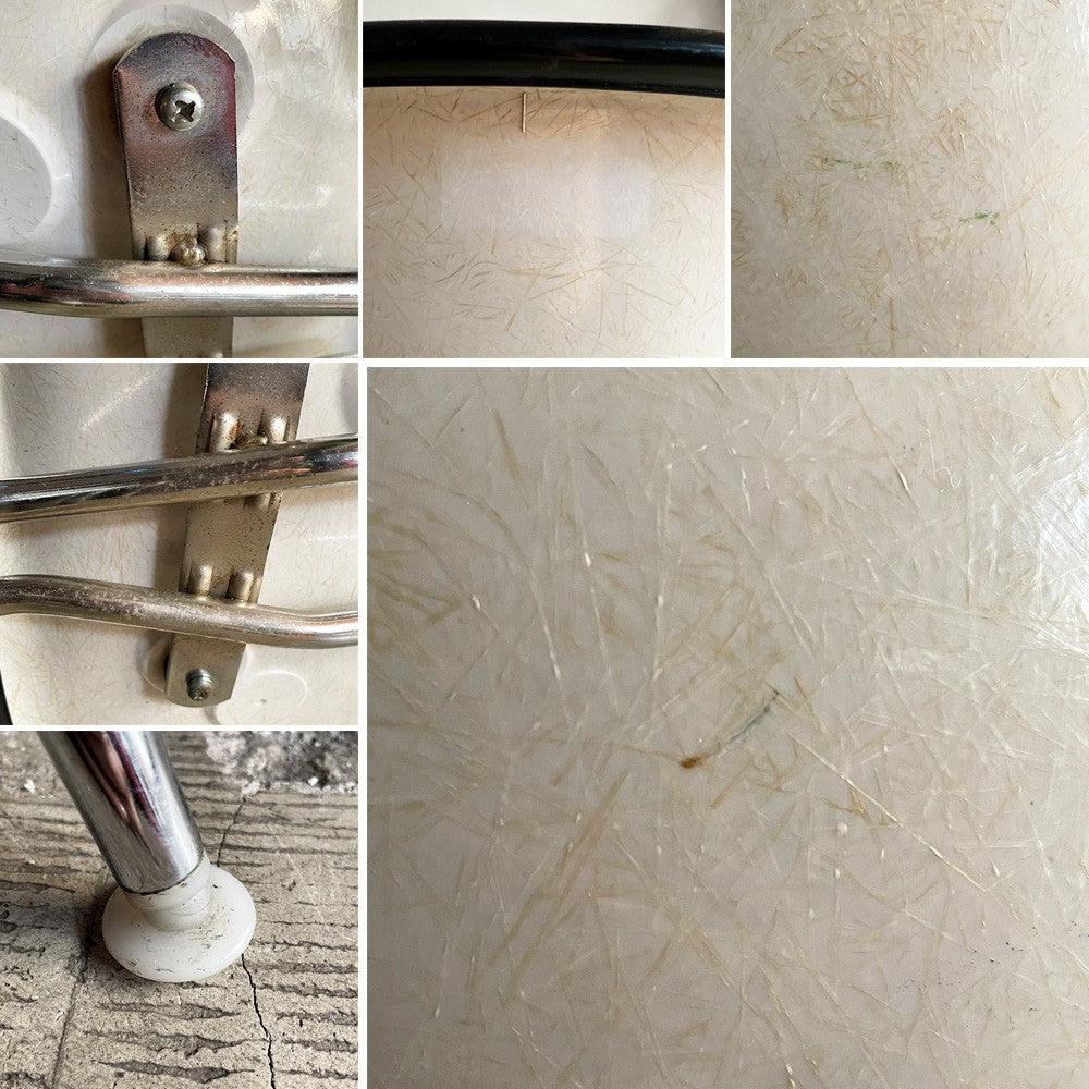 こちらはビンテージのお品物です。使用・経年に伴い、シェルには擦れや傷、僅かな黄ばみなどが見受けられるとともに、クリーニングで取りきれない汚れが確認できます。また、座面レザーの細かな擦れや点状の白い汚れ、僅かな破れや縁の削れ、脚部の表面の剥がれやざらつき、くすみや錆び等がございます。