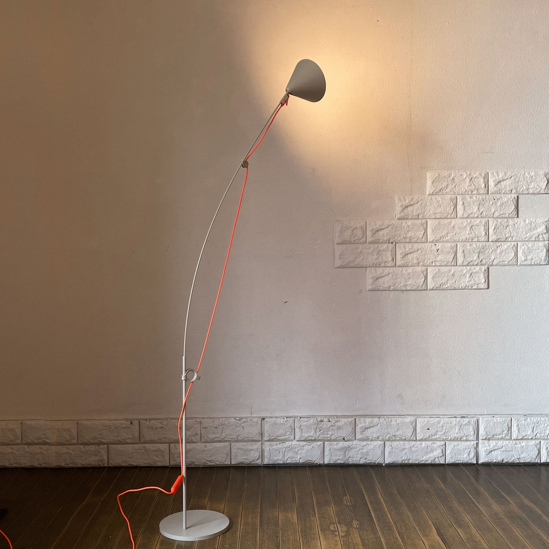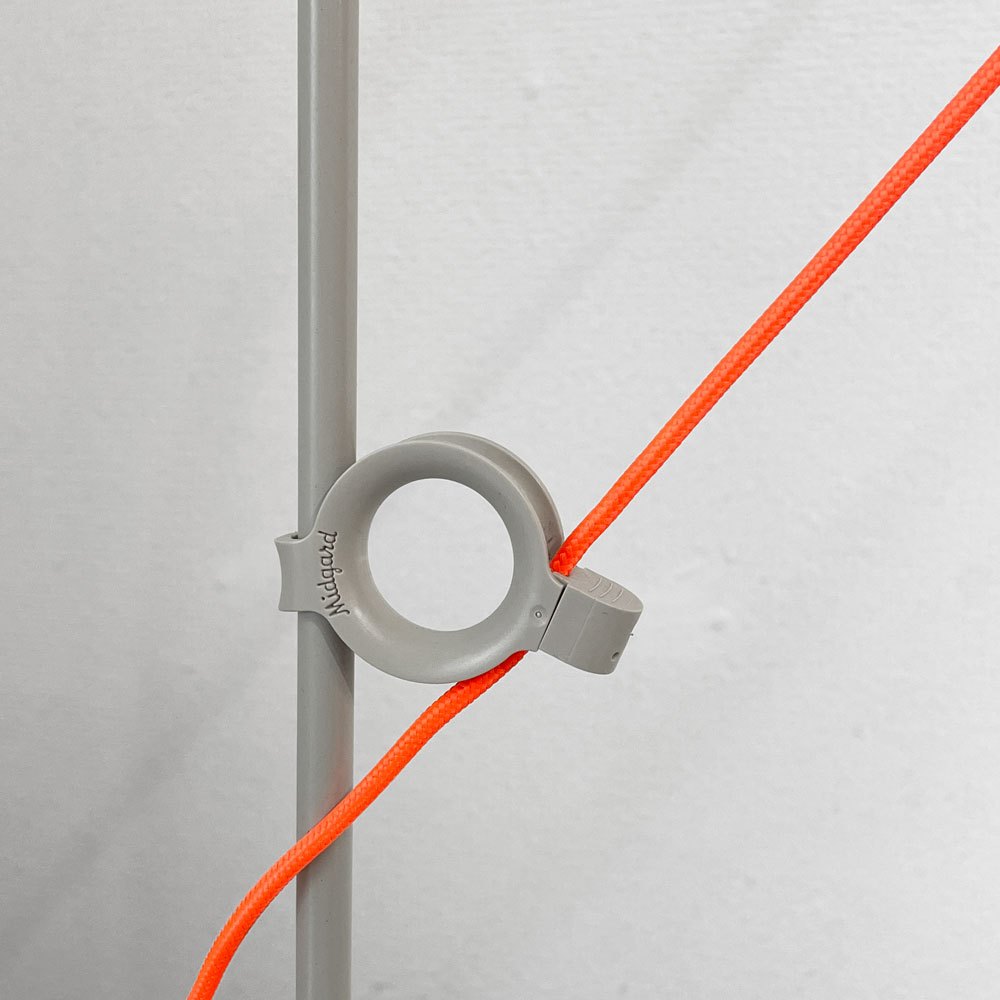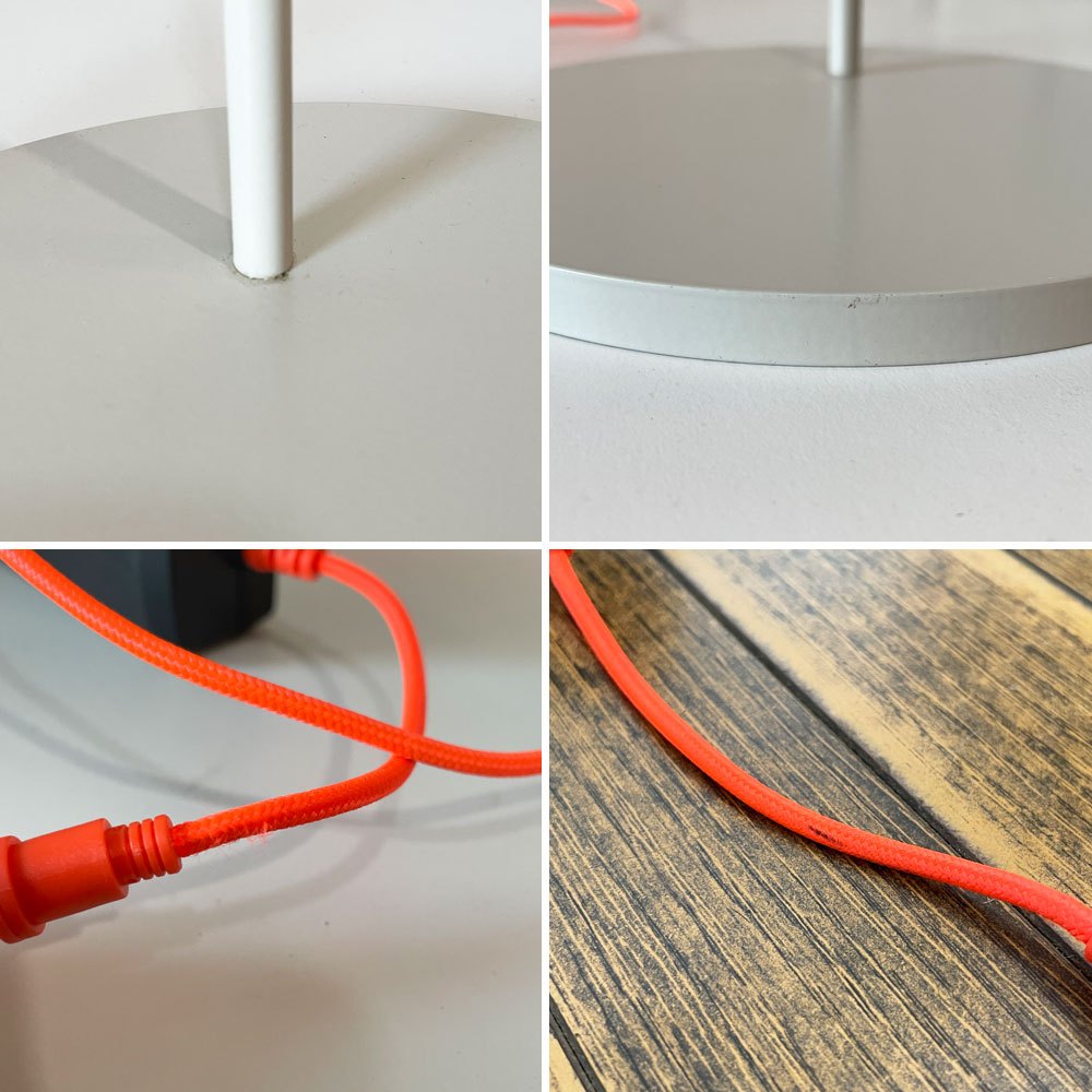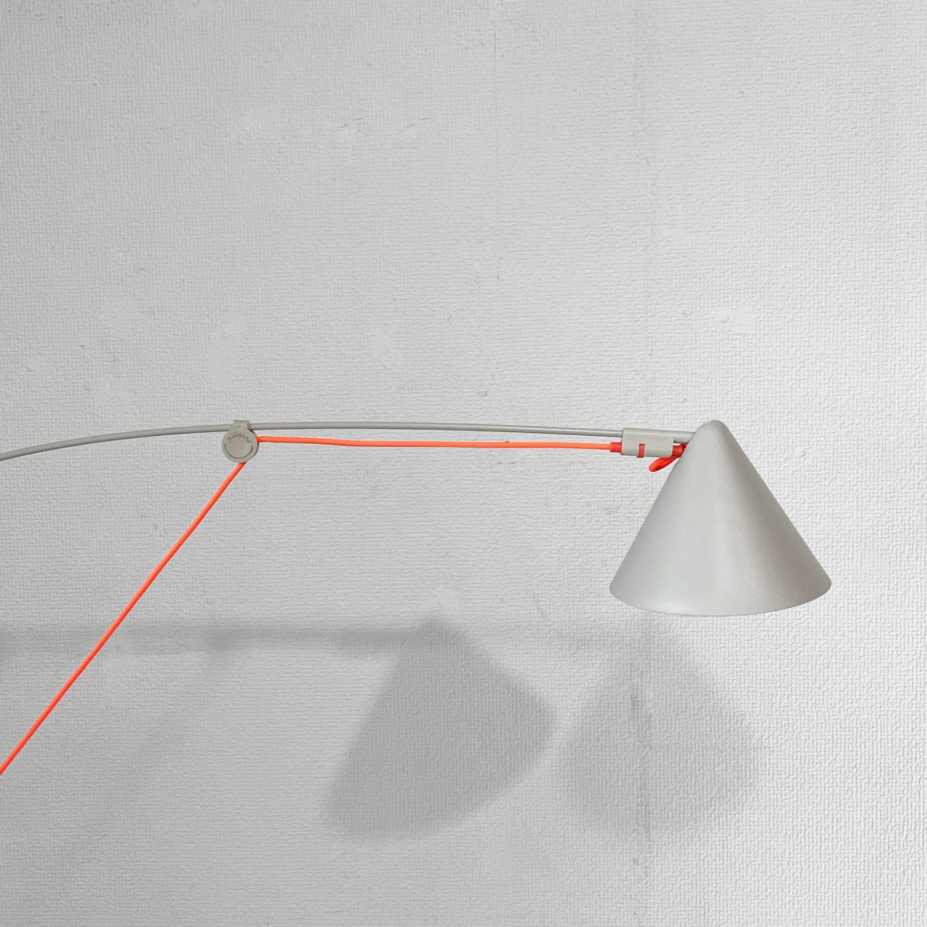 ベースからシェードまで流れる様なロッドは、釣り竿の様なしなやかさで安定し、折り返しのない美しい曲線がエレガントな雰囲気を演出しています。対して、ケーブルはロッドの途中2箇所でピンと張られ、有機的なシルエットに対して直線が心地よい対比を生み出します。暮らしに溶け込むシルクグレー色の本体に対して、ネオンオレンジの蛍光色が鮮やかな差し色となり、ロッドとケーブルそれぞれの個性の違いを分かりやすく強調させているようです。