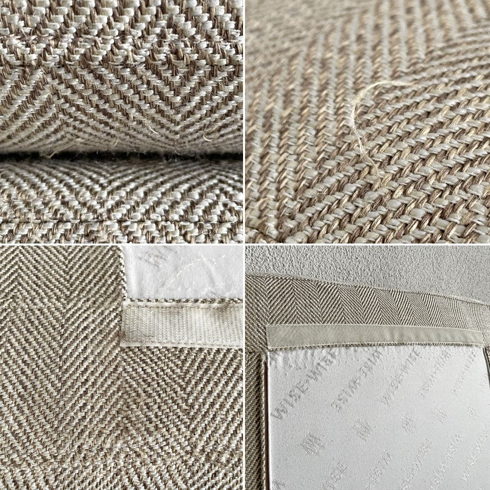 ファブリックには全体に毛玉や毛羽立ち、糸の飛び出しが見受けられるとともに、一部ほつれを縫い繕った箇所が確認できます。また、若干のクッションのへたりやフレームの型崩れ、マジックテープに触れる生地表面の荒れなどはありますが、目立ったシミ汚れ等はございません。その他、脚部の擦れや傷、打痕、ペン痕等はあるもののがたつきやぐらつきといった不具合はなく、今後も安心して実用いただけるコンディションを保っております。